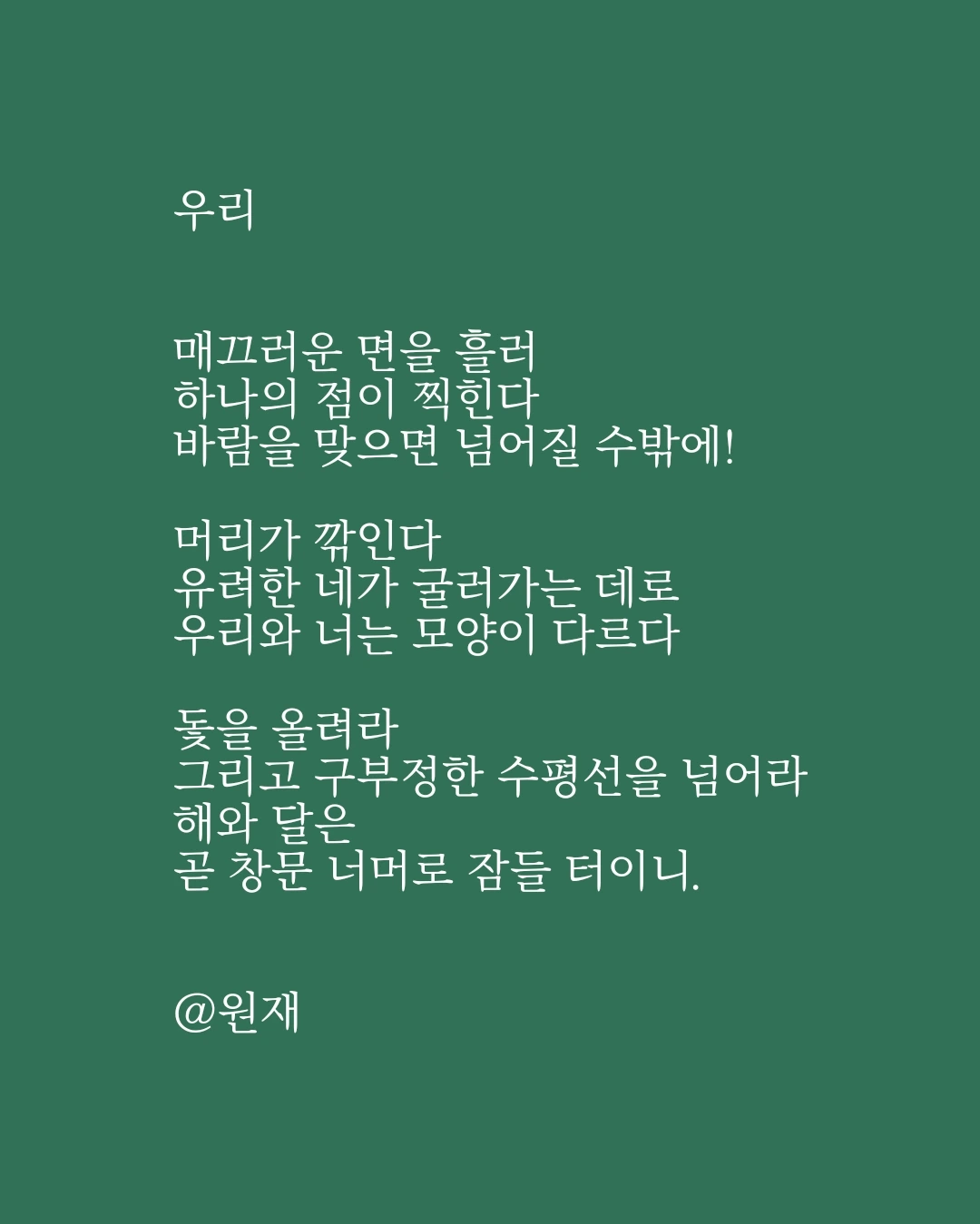 부모는 서로를 점점 닮아간다. 당기는 힘이 강해질수록 우리는 희미해졌다. 너의 실수는 우리의 실수가 되고 우리의 기쁨이 나의 목표가 되어가는 과정에서 우리는 거칠게 충돌하곤 했다. 빛을 잃고 떨어진 파편은 우리가 둥글어지고 있다는 체념적인 증거였다. 가끔은 멀어지기 위해 애를 써야 했다. 결코 잃지 말아야 할 모서리가 아직 몇 개 남았으니.