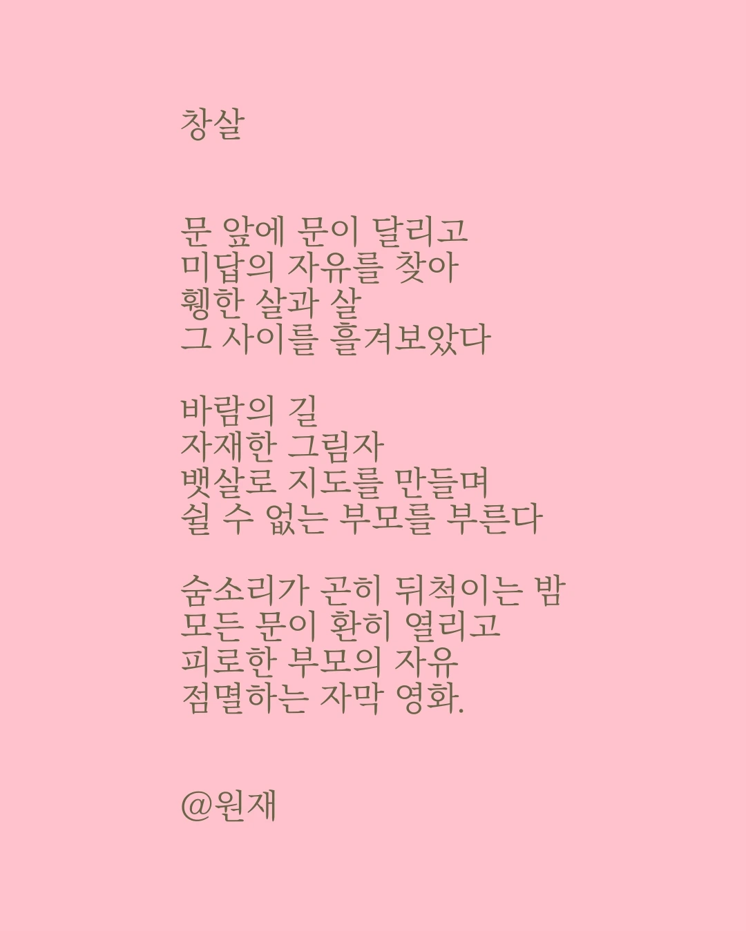 아이를 마루에 풀어놓고 창살 너머로 도망친(?) 부모는 해야 할 일이 산더미다. 혼자 놀다 금세 심심해진 아기는 안전문 창살을 쥐고 흔들며 우리를 부른다. 아이가 활발해질수록 부모의 삶은 급격한 속도로 흥미진진해진다. 육아책을 읽다가 지금은 아무것도 아닐 수도 있다는 생각이 문득 들었다. 싸늘하다.