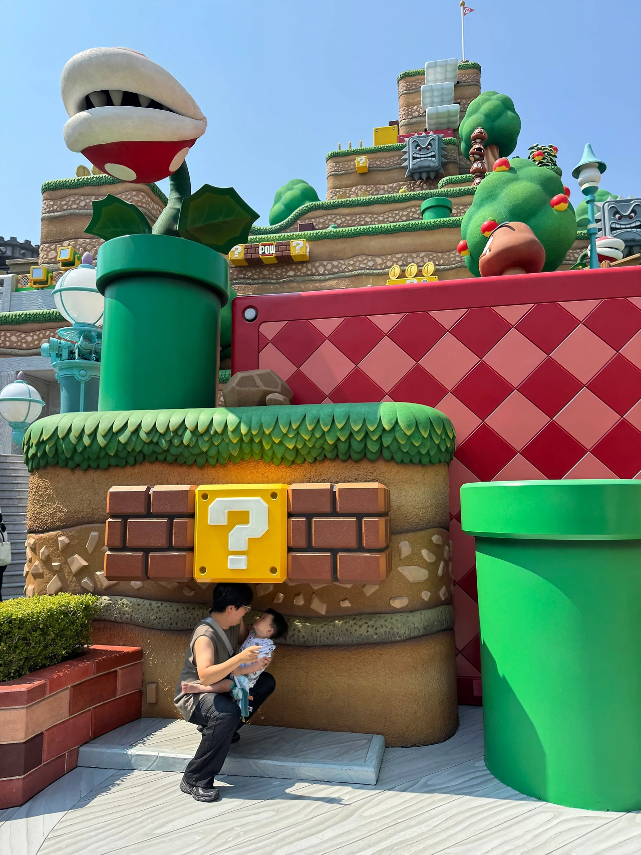 마리오 시리즈의 동네북이라고 할 수 있는 굼바가 눈알을 부라리며 우리를 내려다보고 있었으며, 뾰족한 이빨을 드러낸 뻐끔 플라워와 무시무시한 인상의 동키콩을 본 아이는 외마디 비명을 지르며 고개를 휙 돌려버렸다. 칭얼거리는 아기를 품에 안고 물음표 박스 아래의 그늘로 피신했는데, 이곳에선 아빠가 외마디 비명을 내지르고 말았다. 입구에서 판매하는 4만 원짜리 전용팔찌를 착용하고 박스를 두드려야만 경쾌한 멜로디 소리가 '띠리링'하고 울리는 것이 아닌가. 팔찌가 없다면 이보다 우울기 힘든 '우우우웅'소리를 '옛다'하며 던져준다. 독점시장의 고질적 횡포가 아닐지!