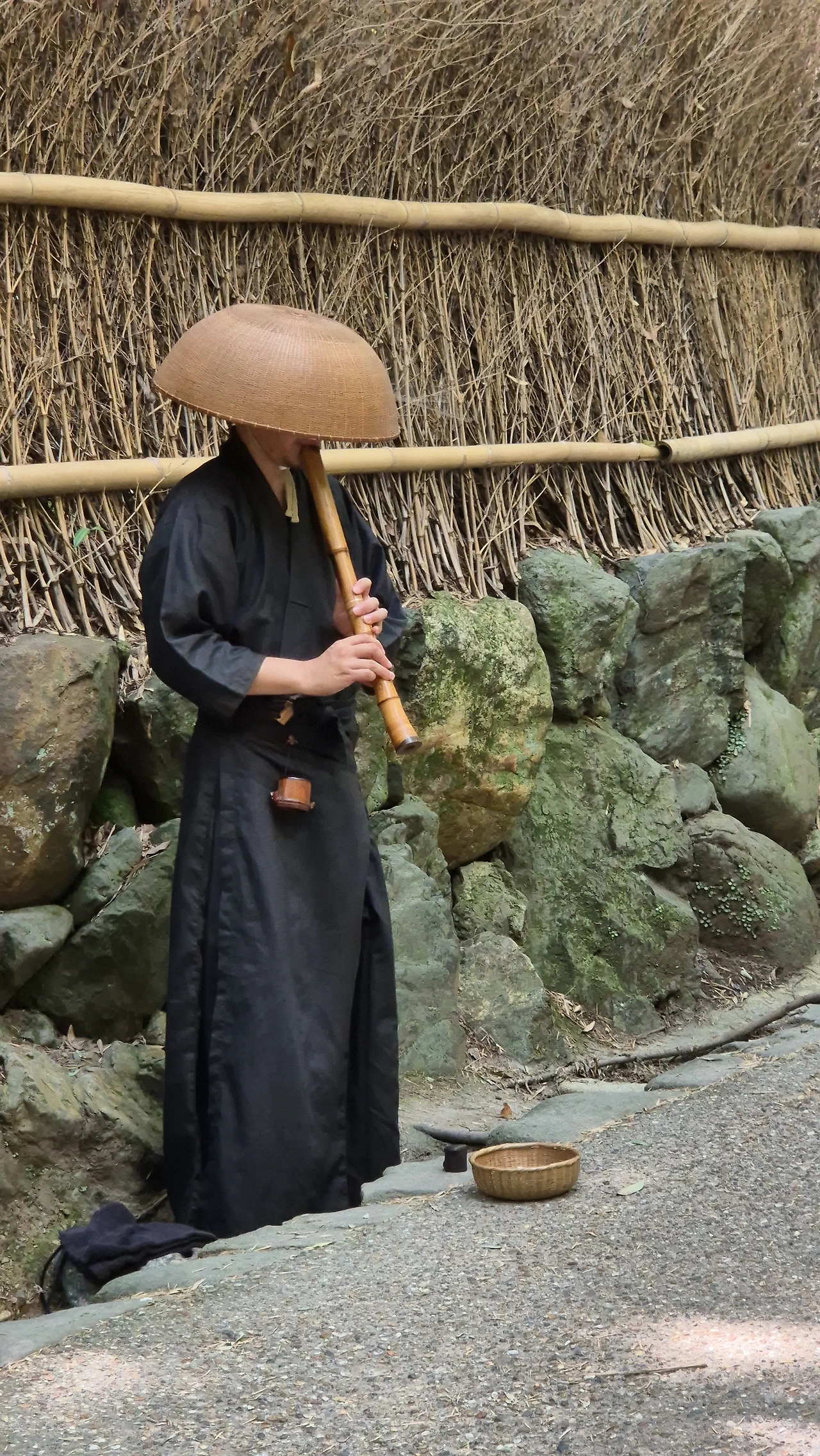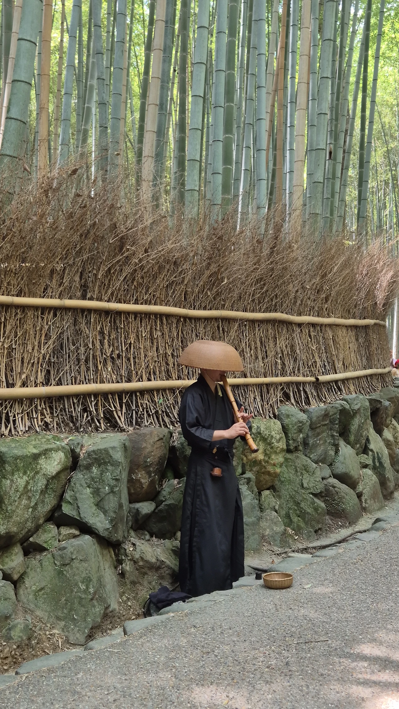 대나무 숲 사이로 구슬픈 피리 소리가 들려온다. 사람들의 발길이 멈춘 곳에서 바구니를 뒤집어쓴 한 남자가 일본 전통 악기인 샤쿠하치를 불고 있었다. 산책로에서 입장이 가능한 텐류지가 바로 선종계 사찰인데 선종 스님들은 이런 버스킹과 유사한 방식으로 탁발을 행한다고 한다. 이들은 한국의 스님과는 달리 삭발을 하지도 않고 유랑을 하며 수행을 하는데, 정체를 쉽게 숨길 수 있는 외관 덕에 다이묘들이 첩자로 활용하는 경우가 많았다고 한다. 고구려의 장수왕도 도림이라는 스님을 백제에 첩자로 파견하였었는데, 사람 사는 세상은 이래저래 비슷한 양태를 띌 수밖에 없는가 보다.