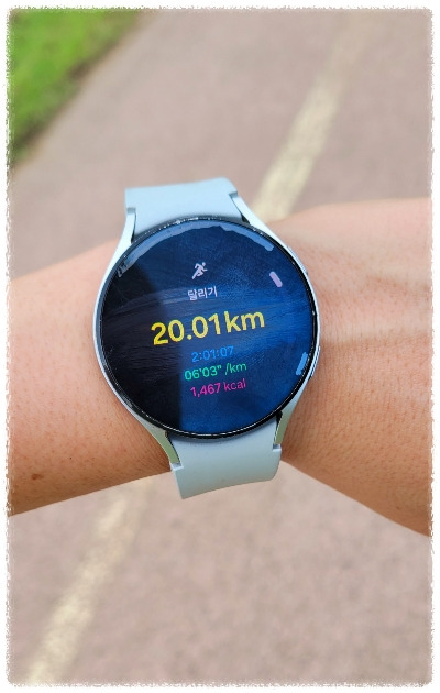 하는 생각을 했다. 하지만 지나고 보니 이것은 참으로 야무진 꿈이었다.ㅎㅎ 앞서 10km를 뛸 때 내 컨디션과는 전혀 다른 양상으로 흘러가기 시작했다. 나는 2~3km 정도 지나면서 체력이 확 떨어지는 걸 느꼈다. 그래도 처지지 않으려고 기를 쓰고 남편 뒤를 쫓아갔는데, 허벅지는 점점 무거워지고 안 아프던 무릎까지 아파왔다. 왜 그런 걸까? 20km 정도는 아프지 않고 완주하던 나였는데... 그러던 중 5km 반환 지점을 돌면서 남편이 내게 계획을 변경하자고 말했다. 본인도 발목이 좀 아프다며 오늘은 20km로 끝내자고 했다. 어차피 차가 있는 곳까지는 돌아가야 했기에, 나는 다시 힘을 내어 끝까지 6분 페이스를 유지해 보기로 마음먹었다.
