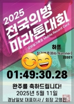 하지만 야구도 9회 말 투 아웃까지 가봐야 알고, 달리기도 결승점에 들어갈 때까지 끝난 것이 아니다! 나는 포기하고 싶어 하는 나를 다독이며 끝까지 끌고 나갔다. 점점 나보다 뒤에 있던 사람들이 나를 앞서 지나가도 내 다리는 말을 잘 안 들었지만, 마지막 남은 1km가 왜 그렇게도 멀게만 느껴지는지 모르겠지만, 그래도 끝이 오기는 온다. 어느덧 집결지였던 운동장이 시야에 들어왔고, 많은 사람들의 응원소리가 들려왔다. 그렇게 끝까지 최선을 다해 달리기를 멈추지 않고 결국 마지막에 점을 찍었다. 그리고 가쁜 숨을 몰아쉬며 휴대폰으로 전송된 나의 기록을 확인해 보았다.