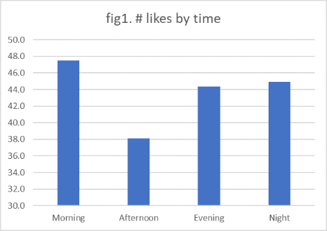 1. 한국시간 기준 오전 (6am-정오)에 올린 글이 좋아요가 제일 많고 오후 (noon-정오)에 올린 글이 제일 적음 (fig.1 참조). 사람들이 오전엔 인스타하면서 놀고 오후엔 일하나?