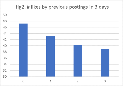 2. 포스팅을 연달아 할수록 좋아요 수가 떨어짐 (fig.2 참조). 사람들의 친절엔 로딩타임이 필요.