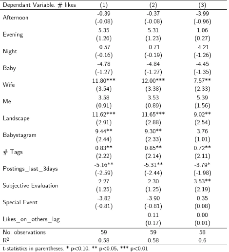 기본적인 아이디어는 다른 변수들(ex. 사진에 대한 주관적 평가, 특별한 일 등)을 다 고려했을 때에도 내가 관심있는 변수 (ex. 시간, 빈도, 등장인물, 해쉬태그)가 결과에 유의미한 영향을 미치는지 보는 것이다. 복잡한 건 나한테도 어려우니 가장 간단한 OLS regression을 통해 분석해 보면 결과가 다음과 같이 나온다.