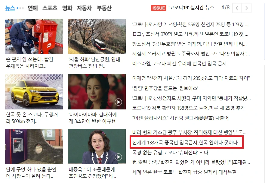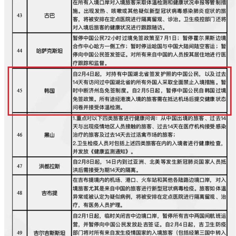 기사가 미심쩍어 직접 이민관리국 홈페이지에 가서 확인해보았다(링크). 기자가 불성실한 건지 의도를 가지고 누락했는지 모르지만, 이 133개국 안에는 한국이 포함되어 있다. 2월 4일 실행된 "14일 내 후베이성 방문 중국인 및 외국인 입국 금지" 조치와 2월 5일 실행된 "제주도 무비자 입국 중지" 조치 두가지가 적혀있다.
