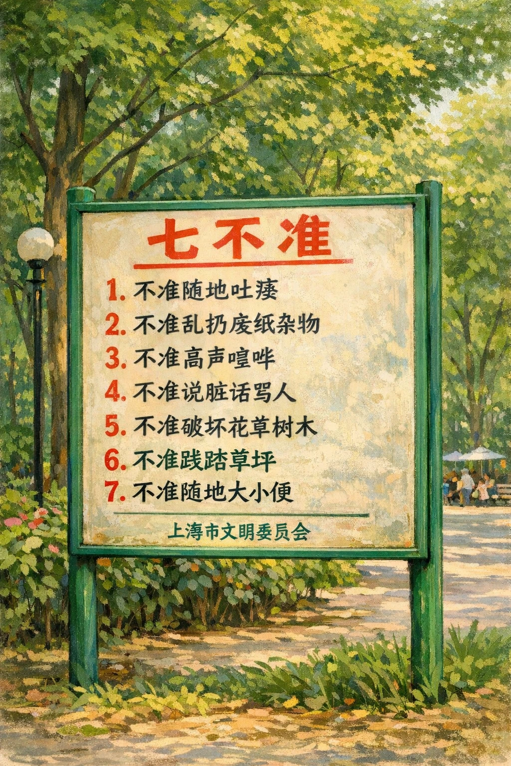 공원 곳곳에는 인민들이 "하지 말아야 하는 일곱 가지 준칙(c七不準)" 등의 공시(公示) 팻말들이 새워져 있었다. 대로변에 큼직하게 "d發展是硬理"나 "e沒有共産黨 就沒有 新 中國" 이란 현수막들이 걸려있었다.