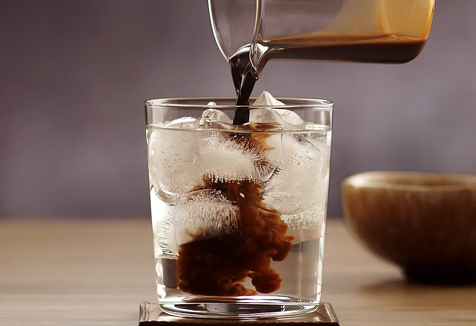 4)커피가 추출되는 약 20~40초간의 시간 동안, 컵에 얼음과 물을 넣어 준비한다.