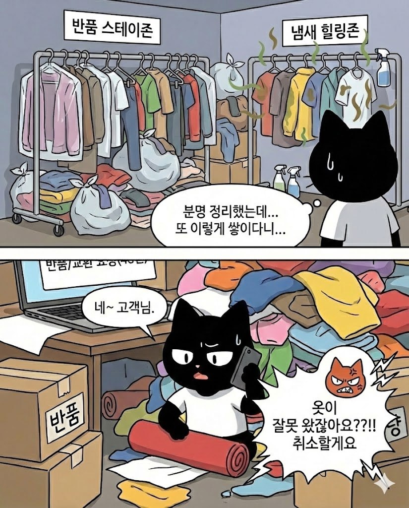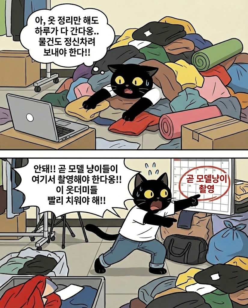 고객 클레임은 쌓이고, 곧 모델냥이들 촬영인데 사무실은 옷더미 지옥... 까망이 살려달라옹!