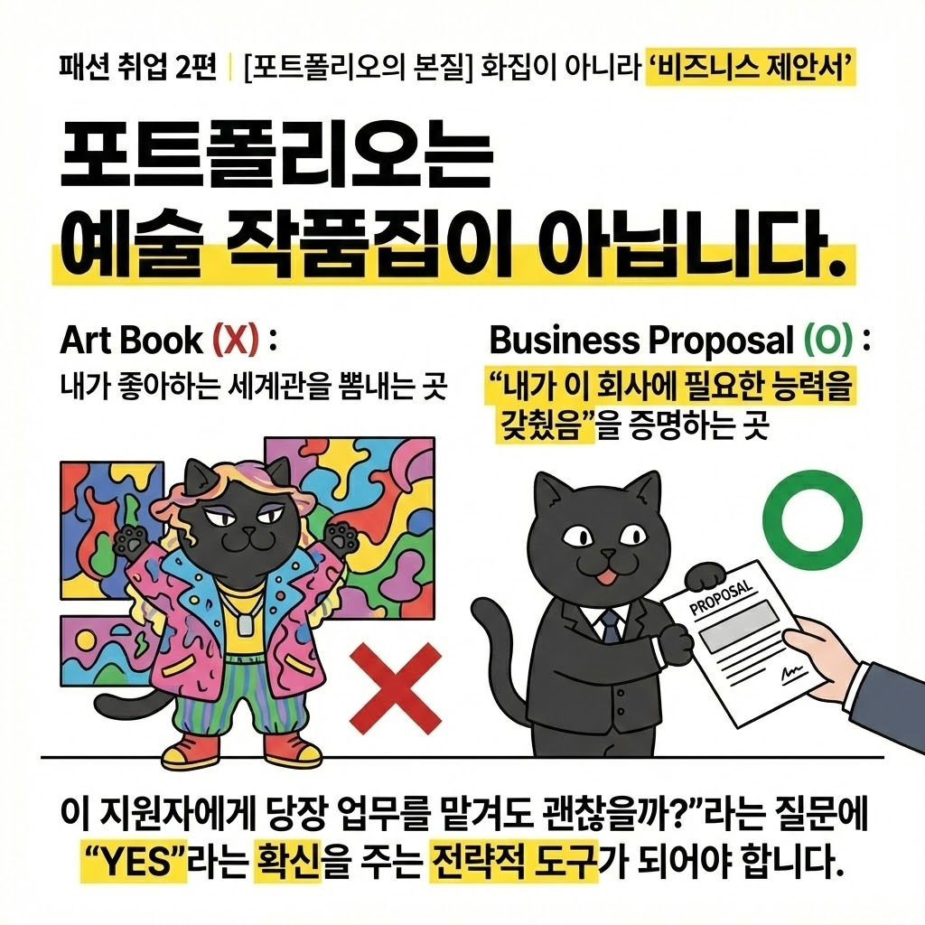 "포트폴리오는 당신의 예술 세계를 보여주는 화집이 아니라, 회사의 해당 직무에 적합한 능력을 가지고 있는지를 보여주는 '제안서'입니다.