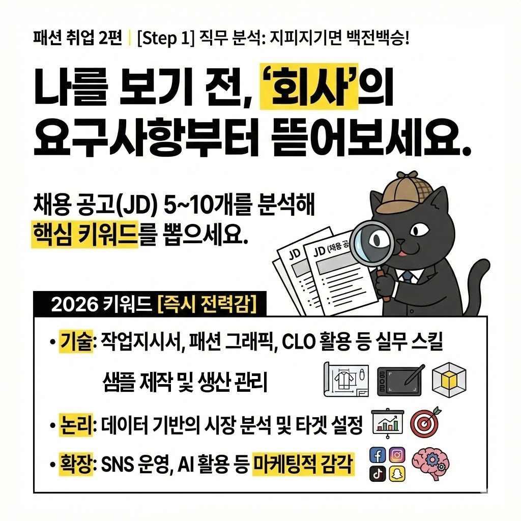 Action: 채용 사이트에서 지원 브랜드뿐만 아니라 경쟁 브랜드의 공고까지 수집하여, 공통으로 요구하는 기술(ex: 도식화 능력, CLO 활용, 트렌드 분석 등)이 무엇인지 키워드를 정리합니다.