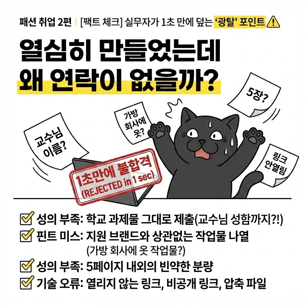 직무 분석 부재: 의류 회사에 지원하면서 가방 작업을 나열하는 등 '핀트가 나간' 구성은 위험합니다.