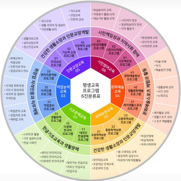 <평생교육법>이 지정하는 평생교육이란 학교의 정규교육과정을 제외한 모든 형태의 조직적인 교육형태를 이릅니다. 아래의 표가 보여주는 6가지 교육에 최근에는 [성인진로개발교육]이 포함되어 모두 21개의 평생교육 프로그램으로 이해할 수 있습니다.