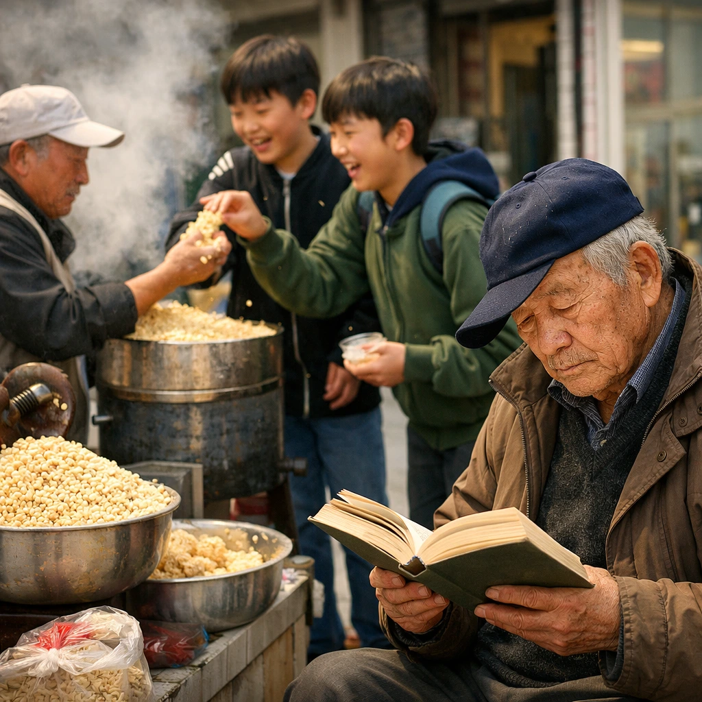 한 달에 두 번 오는 뻥튀기 장수는 아파트 앞 모퉁이에 자리를 잡았다. 재래시장으로 가는 주부들과 아파트 주민을 둘 다 노리기에 좋은 자리다. 그는 호루라기를 한번 불고는 크게 소리쳤다.