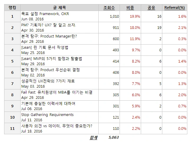 . 1위~3위 - 포괄적 "목표설정 Framework, OKR"의 경우 온라인 서비스/스타트업과 관계없이 KPI, 목표설정 등과 관련하여 비교적 General하게 관심갖는 주제이다. "PM/기획자/UX 잘 알고 쓰자?" 및 "본격탐구: Product Manager란?"은 해당되는 분야가 어느정도 있긴 하지만, 여전히 포괄적인 편이다.