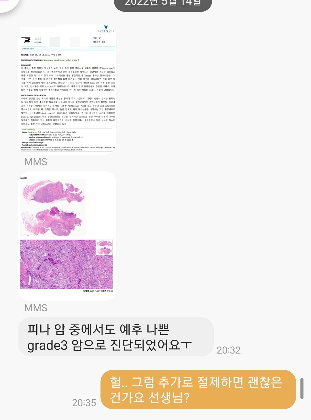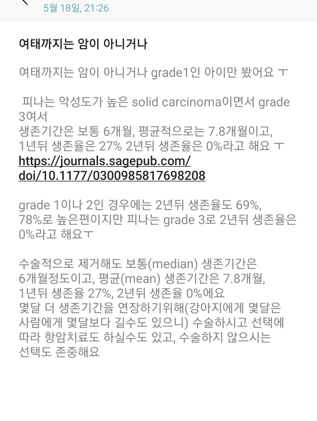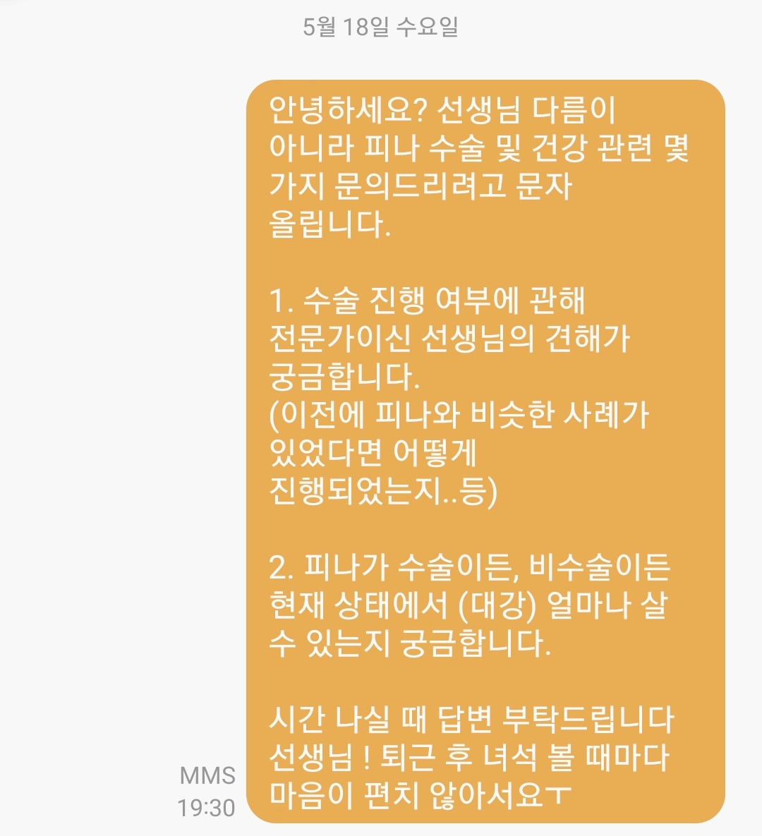 이후 며칠 뒤, 이 녀석이 종양을 제거하며 수술한 지도 얼마 되지도 않았는데 보름도 안 지난 날짜에 수술을 하는 것과 노견인 점을 고려, 수술하는 게 최선인지 병원에 문의했고, 결국 이번 수술은 하지 않고 좀 더 경과를 지켜보기로 했다.