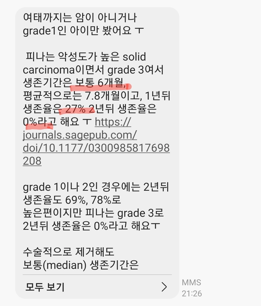 생존 기간은 보통 6개월, 평균 7-8개월. 1년 뒤 생존율 27%, 2년 뒤 생존율 0%.