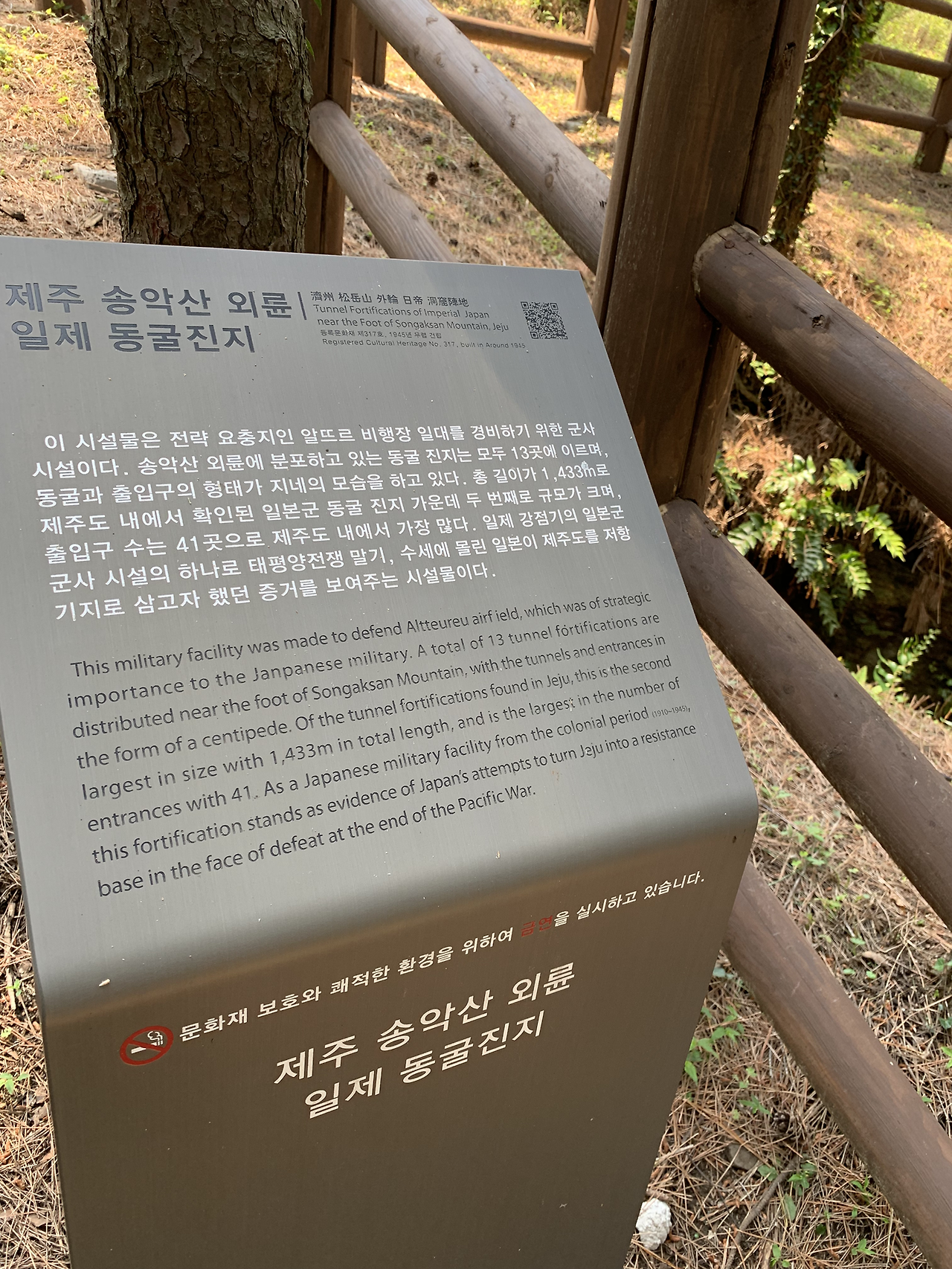 송악산은 제주도 서남쪽에 위치한 올레길 코스다. 주차장에 차를 세우고 주변을 산책하는 이들은 많았지만, 깊숙이 숨어있는 동굴 진지를 찾는 이들은 거의 없었다. 거의 길도 없는 숲을 지나자, 일제가 미국 침공에 대비해 역시 제주도민을 동원해 만든 땅굴 진지들이 모습을 드러냈다. 4·3 사건 당시엔 이곳에 숨어든 도민들도 있었다고 한다.