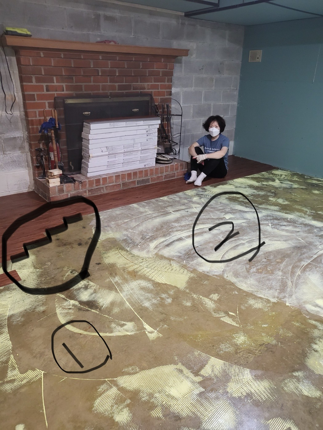 그렇게 Okay를 받고 남편은 접착제를 발랐다. 접착제를 바르고 바로 붙이는 게 아니라 꾸덕꾸덕 해질 때까지 기다렸다 붙여야 잘 붙고 잘 안 떨어진다고 해서 꾸덕해지길 기다렸다. 그리곤 이렇게 붙이라고 몇 장을 붙이더니 남편은 또 접착제를 바른다. 바닥재와 나를 남겨두고 바르고 또 바르고. 그렇게 계속 바르고는 꾸덕해지면 붙이라고 말하고 사라졌다. 그제야 정신을 차리고 보니 나랑 바닥재만 덩그러니.