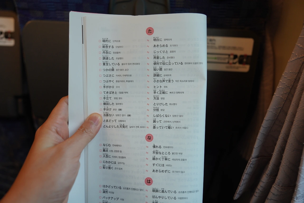 약 한 시간을 정도 눈을 붙였을까?, 눈을 뜨니 차창 밖으로는 산과 들이 번갈아 스쳐갔다. 그 순간 문득, 올해 12월 일본어 능력시험 원서를 접수했던 일이 떠올라, 불안한 마음에 서울에서 가져온 일본어 단어장을 펼쳐 조용히 외우기 시작했다.
