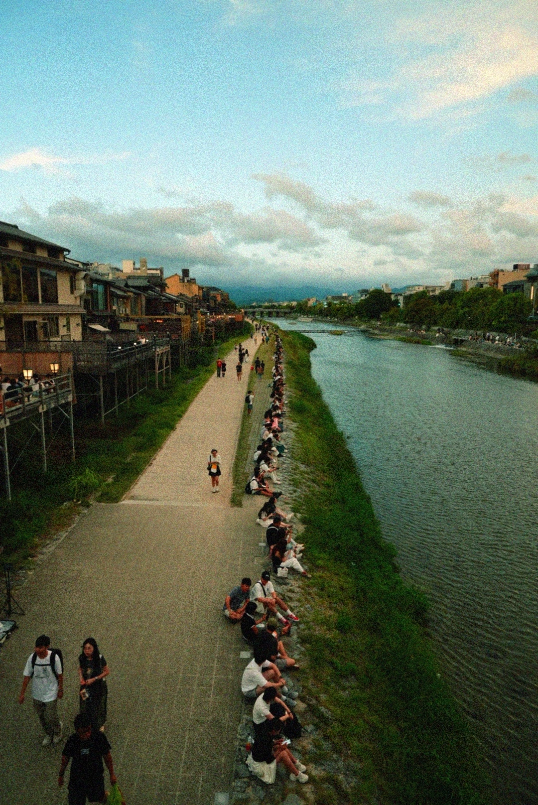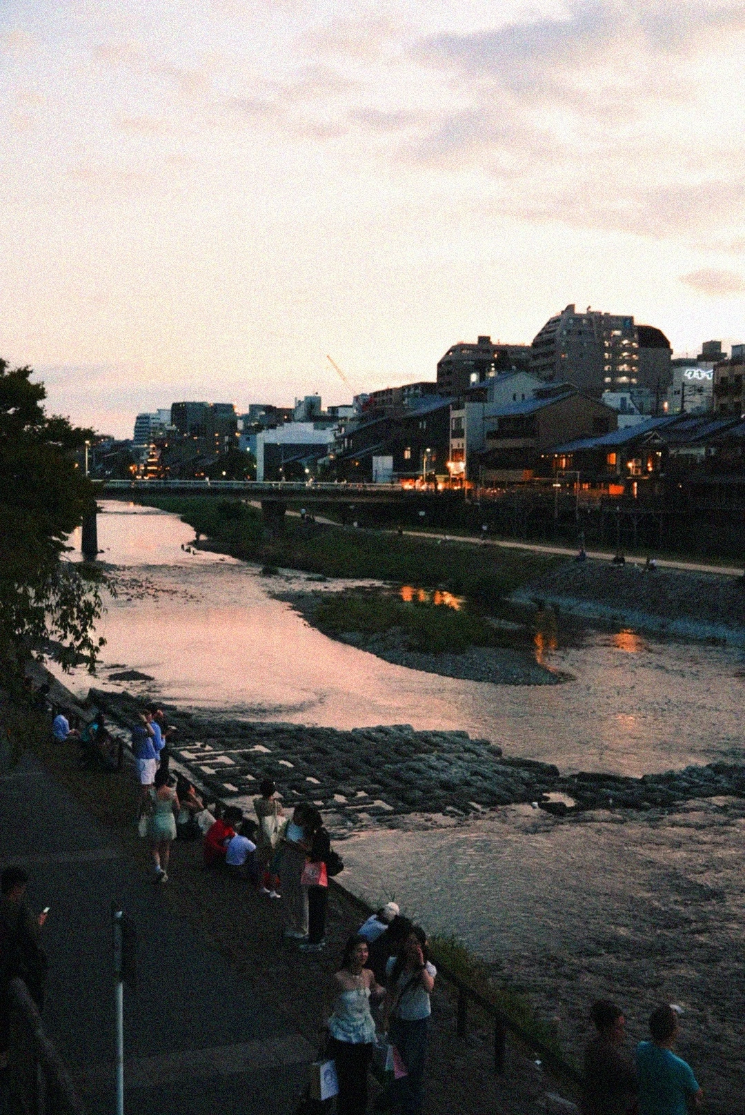 숙소로 돌아가는 길, 석조 다리 위에서 많은 사람들이 사진을 찍고 있었다. 가모강의 노을이 도시를 붉게 물들이는 순간이었다. 나도 그 장면을 놓치기 싫어 셔터를 눌렀다.