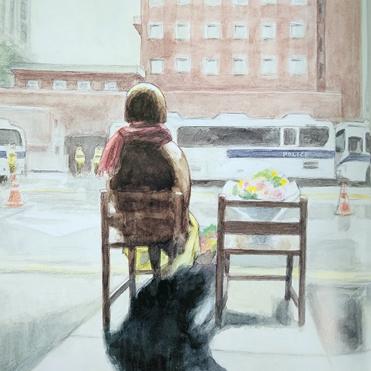 빈 의자는 돌아가신 할머니들을 위한 의자랍니다. 집회 때 위안부 할머니가 앉는 자리기도 하지만 우리가 앉아 공감하고 다음 세대가 풀어가야 할 자리랍니다.