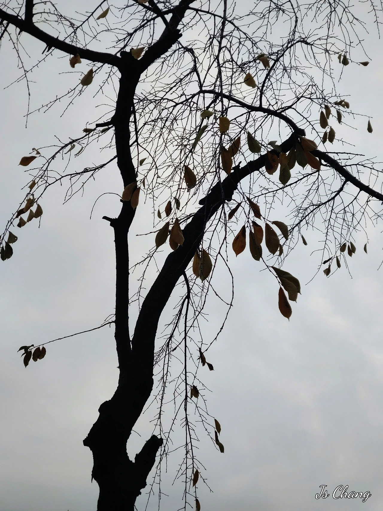 헐벗은 벚나무 우듬지의 새 둥지를 올려다본다