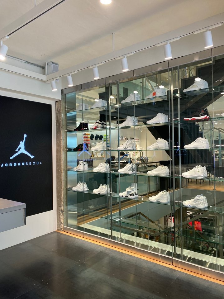 전시되어있는 조던 제품들이 아니라면 스포츠 브랜드 매장이라고 느껴지지 않을 법한 이미지예요.