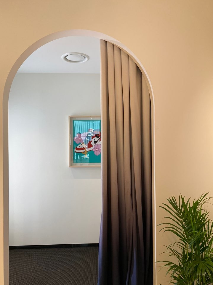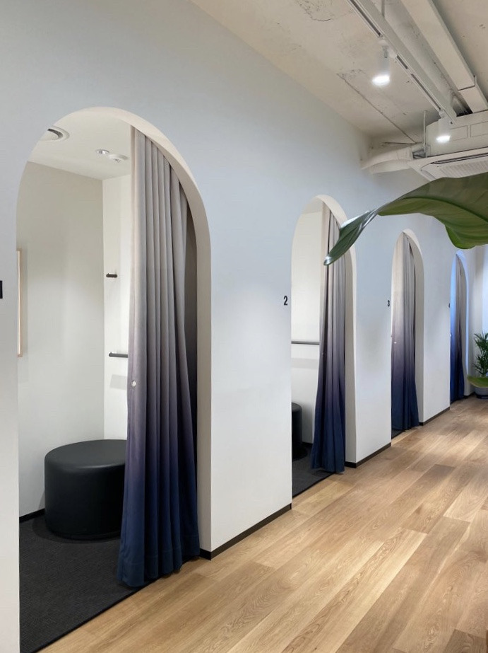 2층의 의외의 포인트 공간은 탈의실입니다. 각 층에 부분 부분 사용된 라운드 처리된 문과 코발트-그레이로 그러데이션 되는 매트한 질감의 커튼의 조합 거기에 키 큰 식물의 조화는 굉장히 여성스러운 이미지를 보여줍니다.