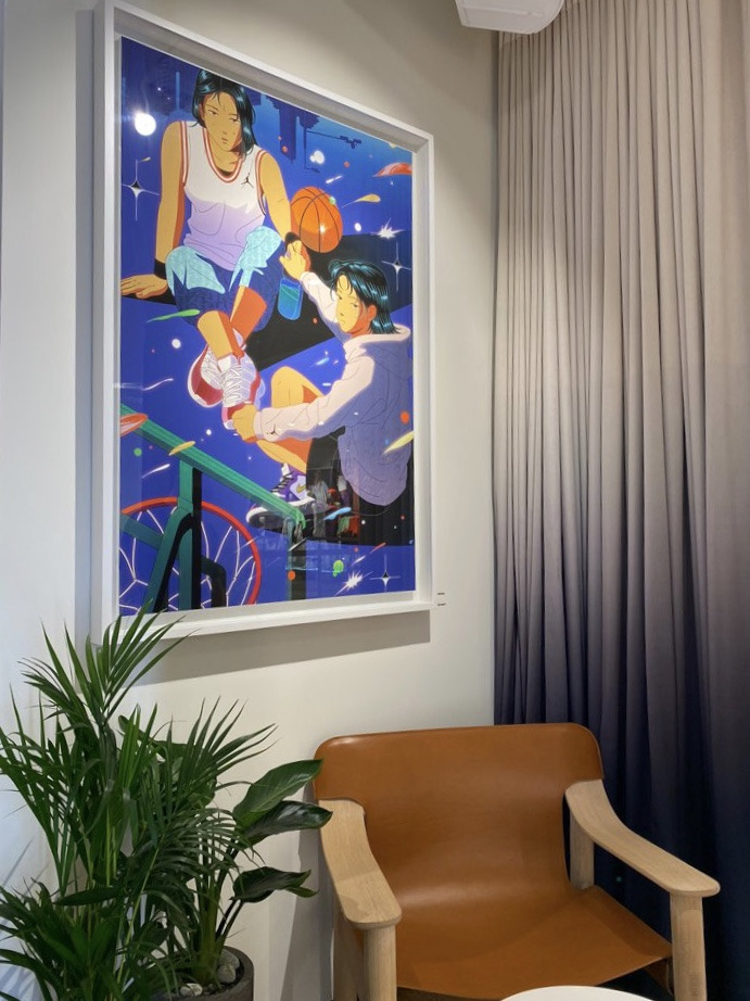 농구코트에 사용되는 우드 플로어링의 바닥과 작가들의 아트웍들이 눈에 띄는 공간입니다.