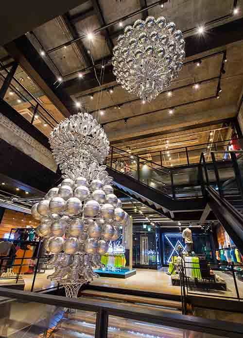 그리고 나이키 강남에서도 봤던 것 같고, 뉴욕의 나이키에서도 봤던 것 같은데 샹들리에가 나이키 몇 개의 층 전체를 관통하는 계단실의 중앙 부분에 어마어마하게 걸려있습니다. 농구화와 농구공으로 된 흰색의 거대한 샹들리에. 다시 생각해 보니 누구의 디자인인지 궁금해집니다.