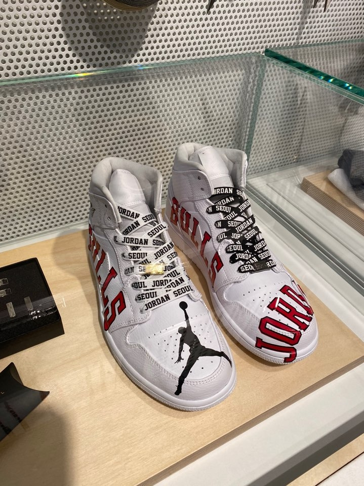 공간보다도 당연히 눈에 더 들어오는 것들은 판매되는 제품 사이사이 전시돼있는 커스텀 된 조던1 제품들입니다. 이 맛에 직접 조던 매장을 들리는 거 같아요.