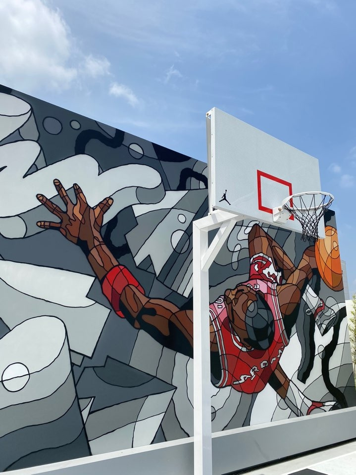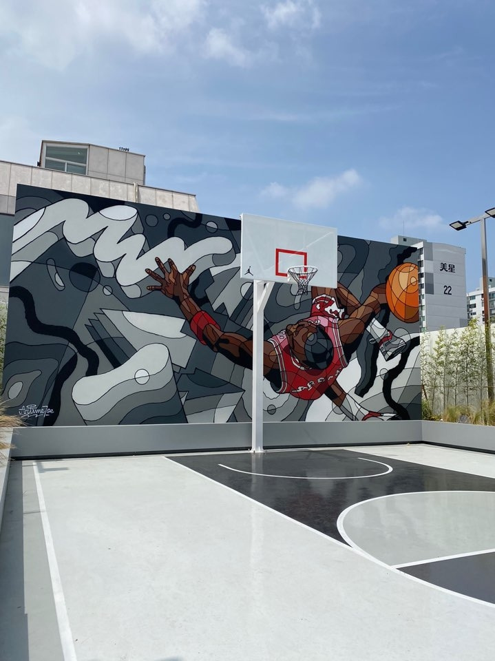 이미 많은 그라피티 작품으로 유명한 알타임조(@artimejoe)의 ‘jump on’이라는 제목의 그라피티가 코트 전체를 압도합니다. 여러 행사에 사용될 이 공간은 조던 서울에 들리신다면 단연 한 번쯤은 인증샷을 찍게 되는 공간입니다.