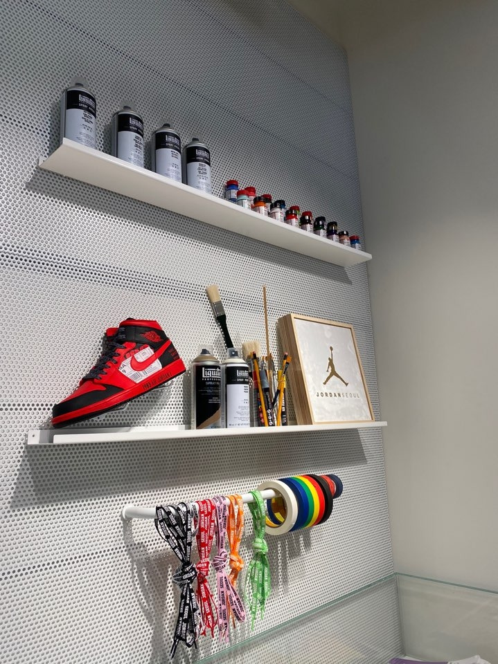 티셔츠 커스텀과 조던1 미드 제품을 각자의 개성에 맞게 커스텀할 수 있는 공간이 마련돼있어 나만의 제품을 갖고 싶은 사람들에게 매력적인 장소이기도 합니다. 제가 갔던 날에도 굉장한 실력자들이 각자의 조던1을 만들고 있었어요. (조던1 벤엔 제리 버전으로 커스텀하시던 아저씨.. 정말 최고였어요!)