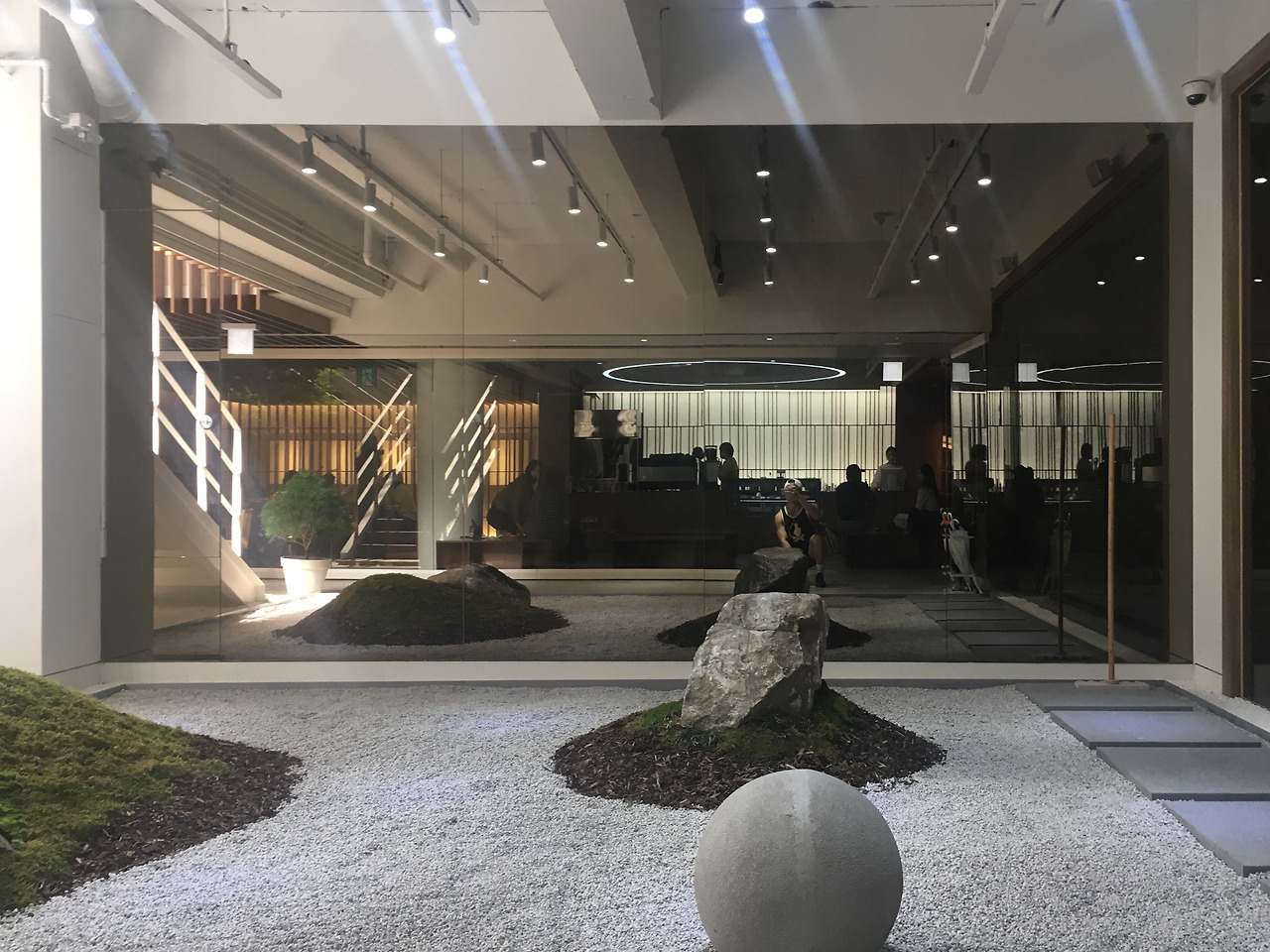 내부 공간의 중심에는 커피를 주문할 수 있는 바와 좌석 공간, 그 양 옆으로는 시즌마다 큐레이팅 되어있는 서점의 공간과 그 반대편에 기획 운영되고 있는 전시장 공간이 위치합니다. 그리고 이 세 공간을 아우르는 *일본식 정원의 공간이 외부와 내부의 사이에 위치해 분위기를 차분하게 눌러주고 있습니다.