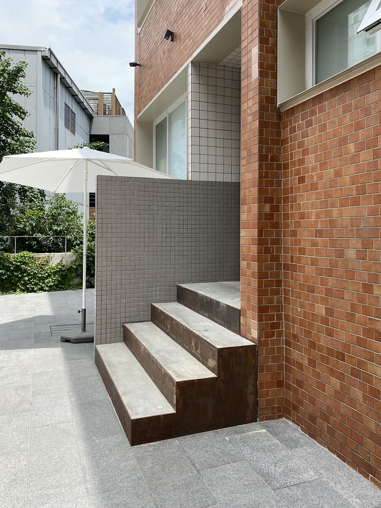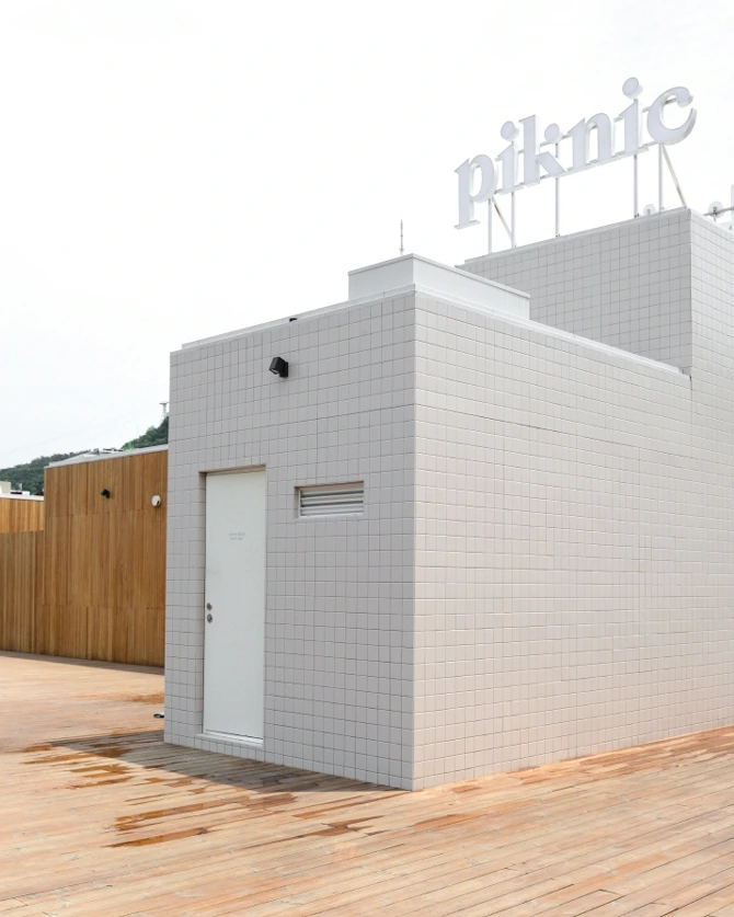 같은 결과물이라도 그 의미에 따라 다가오는 느낌이 달라지기 마련인데요. piknic의 첫 이미지로 다가온 적갈색 타일과 함께 어우러진 밝은 컬러의 정사각 타일을 포인트의 한 부분으로 뽑고 싶어요. 트렌드로 떠오르는 ‘레트로’한 이미지를 표현하기 위해 많은 공간에서 정사각 타일을 사용하지만 piknic의 뒷 출입구 캐노피(입구에서 비를 맞지 않도록 툭 튀어나온 처마)에 사용된 타일과 타일의 크기에 맞춰 가늘게 뽑아낸 기둥은 입구 주변의 나무들과 어우러져 한여름의 날씨에도 굉장히 경쾌한 기분이 들게 해 주었습니다.