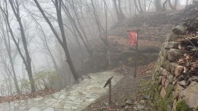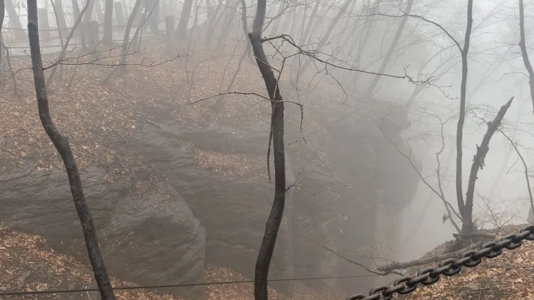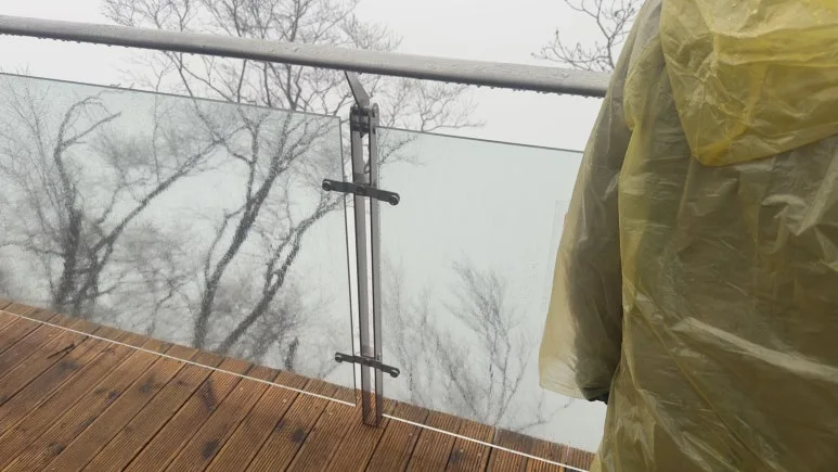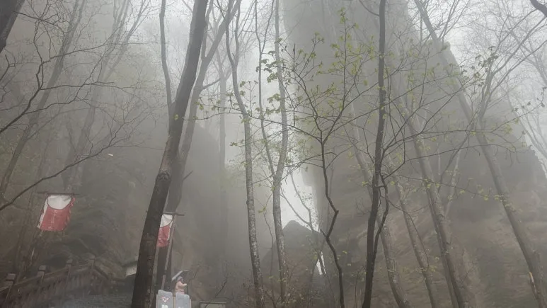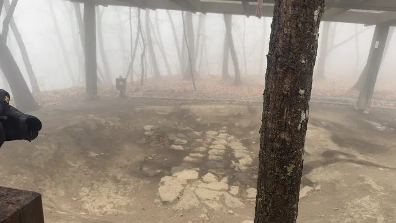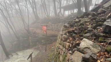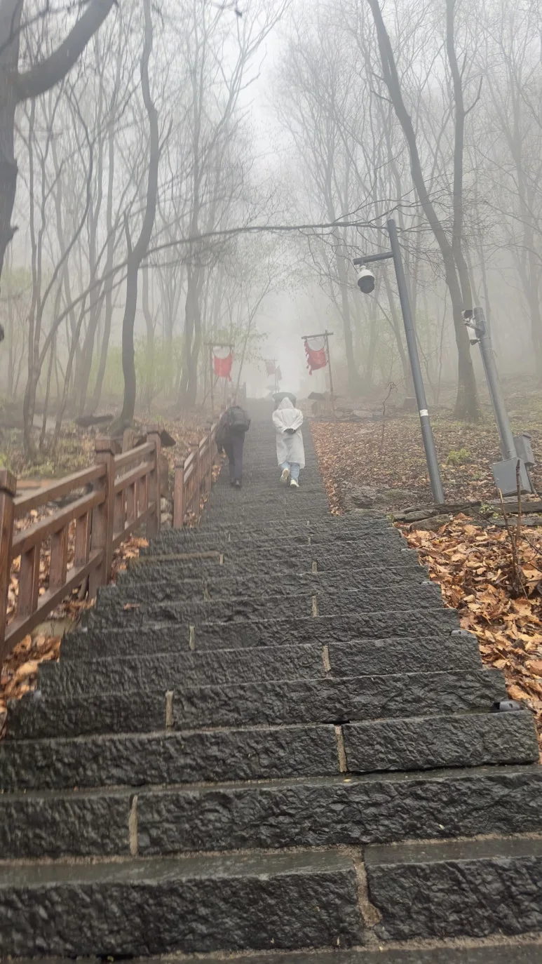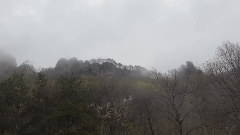 그러나 나의 기대를 짓밟듯이, 위로 올라가니 연무가 더 심해졌다. 비와 연무 때문에 신선이 나올법한 분위기가 연출됐다. 이 사진을 본 누군가는 추모왕으로 인해 비가 내려 죽을 위기에 쳐한 송양왕 시점이라 했는데 당시에는 앞이 보이지 않아 답답한 마음이 들었다.