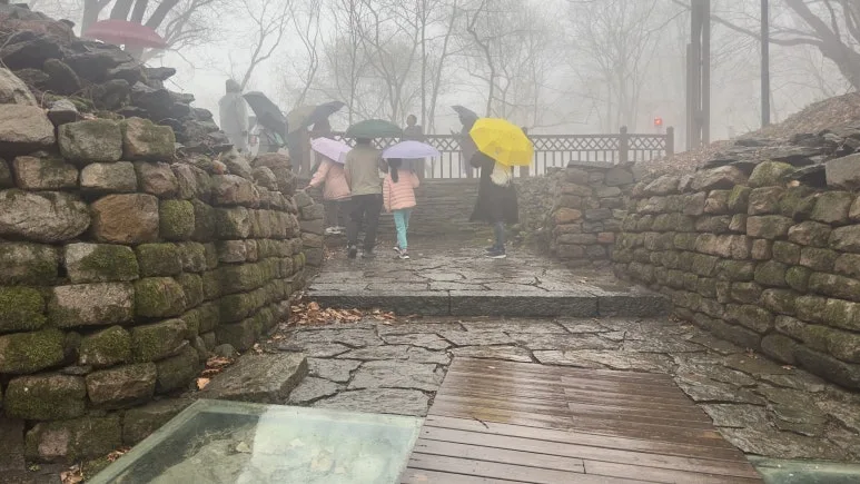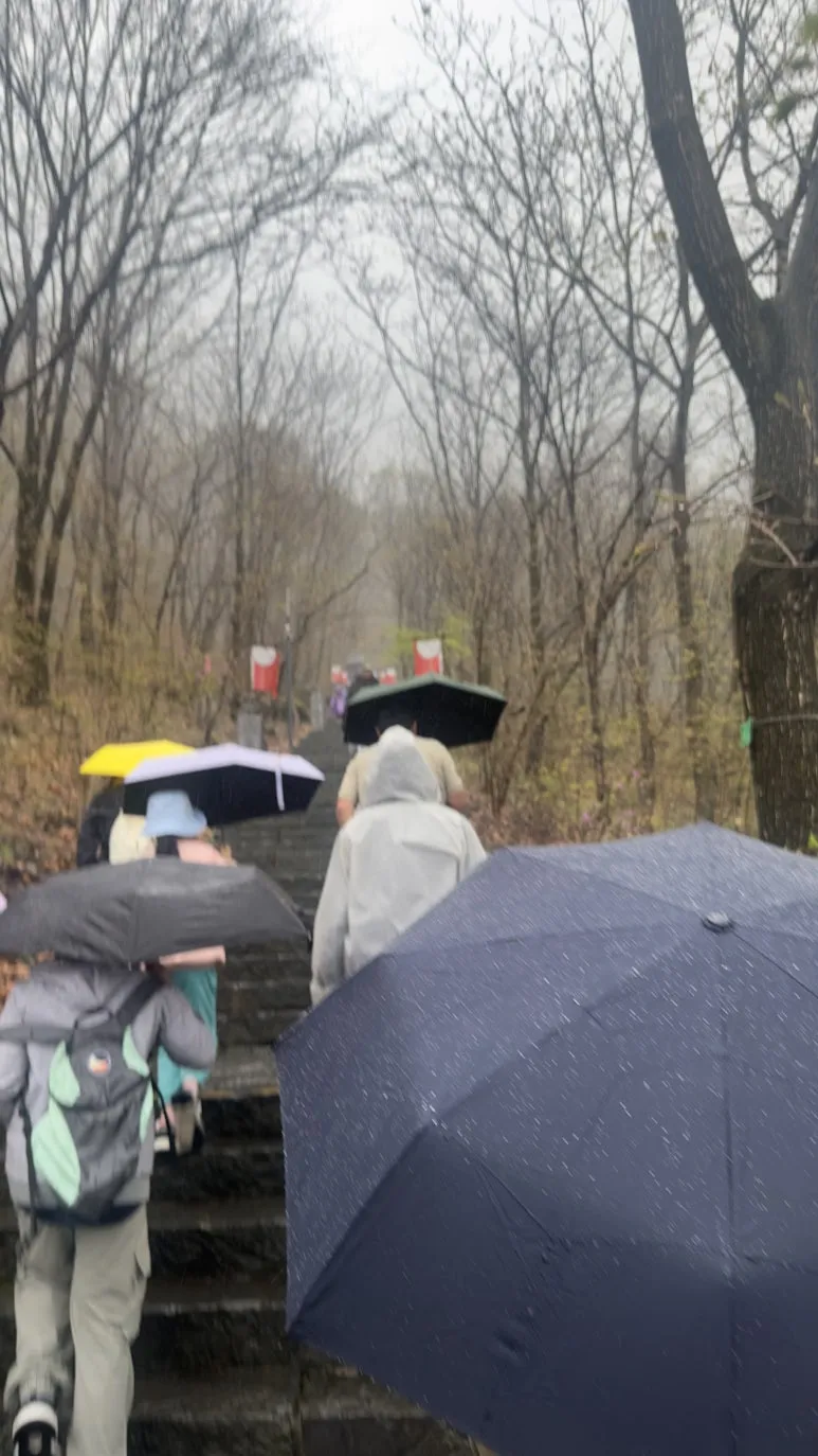 그럼에도 가만히 있을 수 없었다. 우산을 받쳐 들고 오녀산성을 오르기 시작했다. 혹시 산 정상에 오르면 풍경이 달라질 것을 기대한 채 오르기 시작했다. 다른 고구려답사기나 영상을 보면 정말 힘들어하던 곳인데 비가 와서 미끄러워 정말 위험하다고 여겼다. 정말 가파르고 높아 금세 쉬는 분들이 많아졌다.