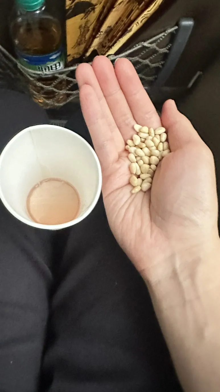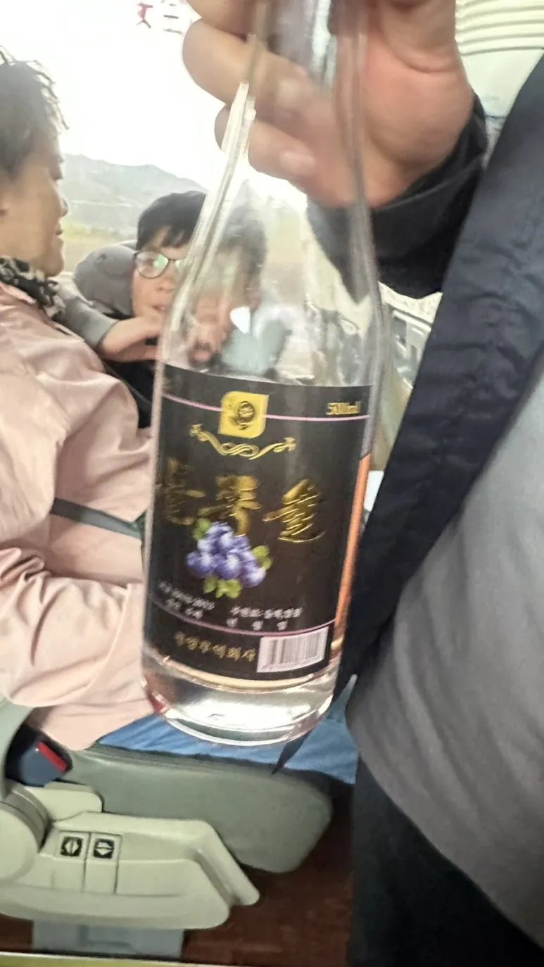 장시간 동안 버스를 타니 몸은 뻐근하고 심심해졌다. 그때쯤 가이드님이 다들 한잔씩 하라고 북한 술을 가져왔다. 이 술 역시 40도였는데 왠걸, 맛있다.
