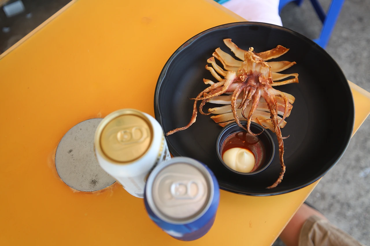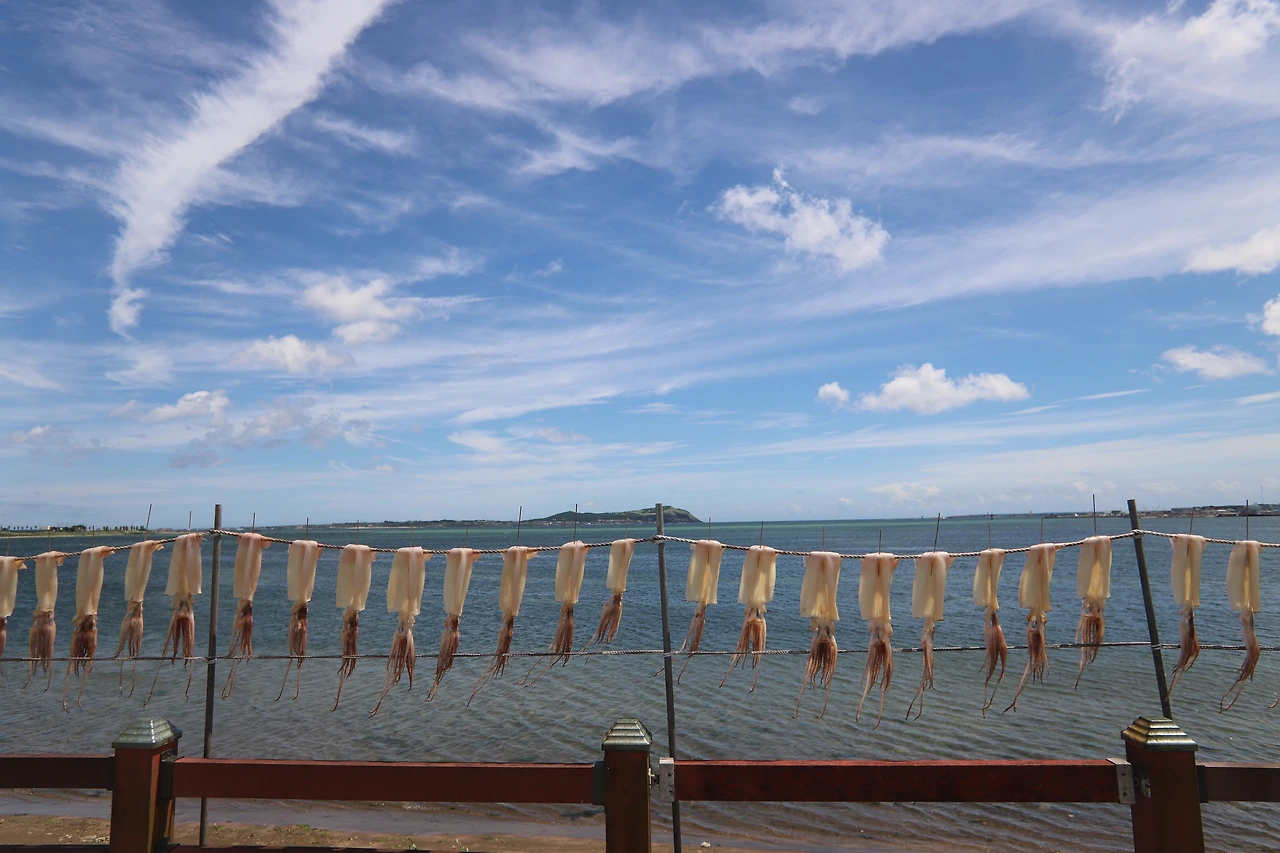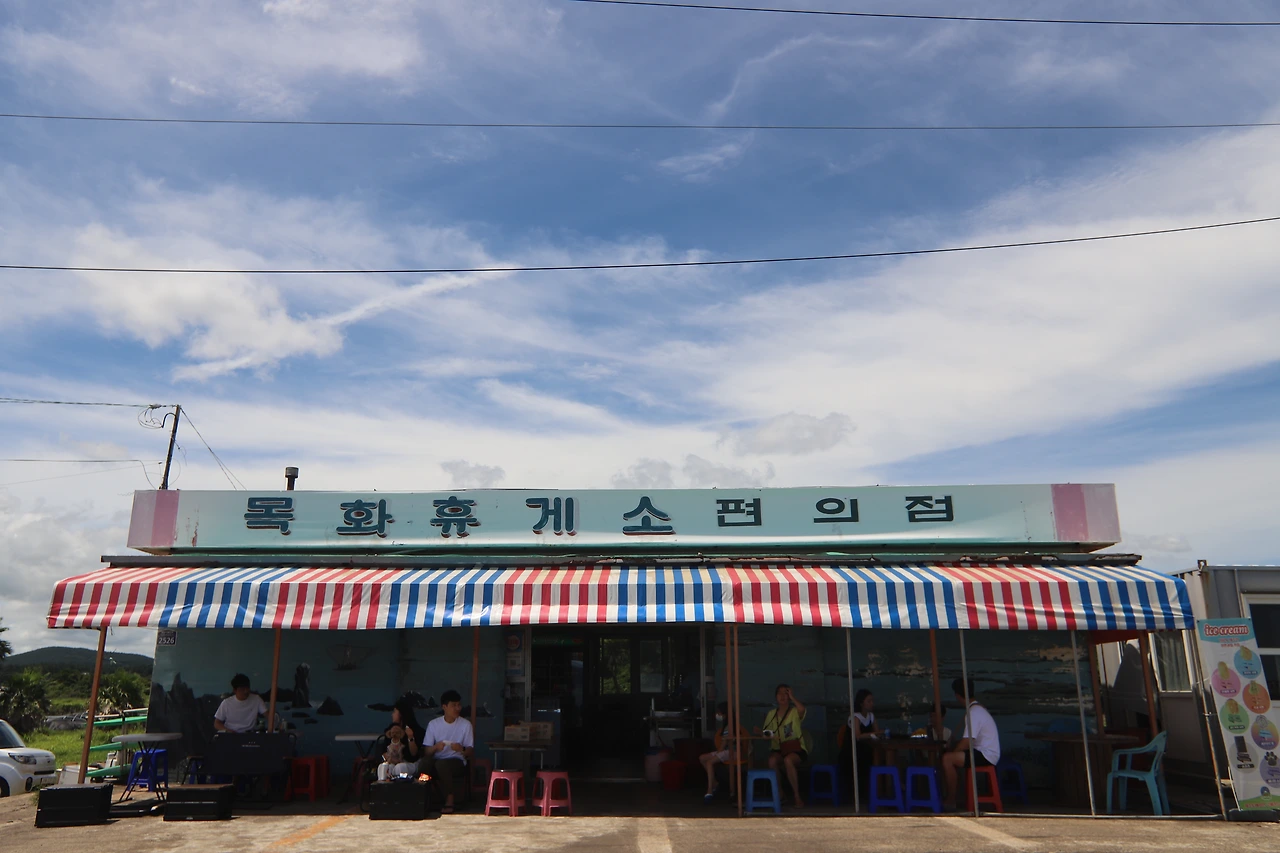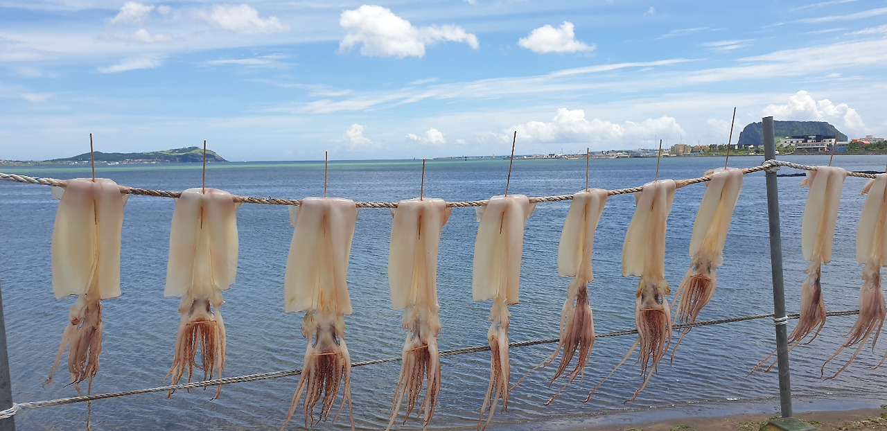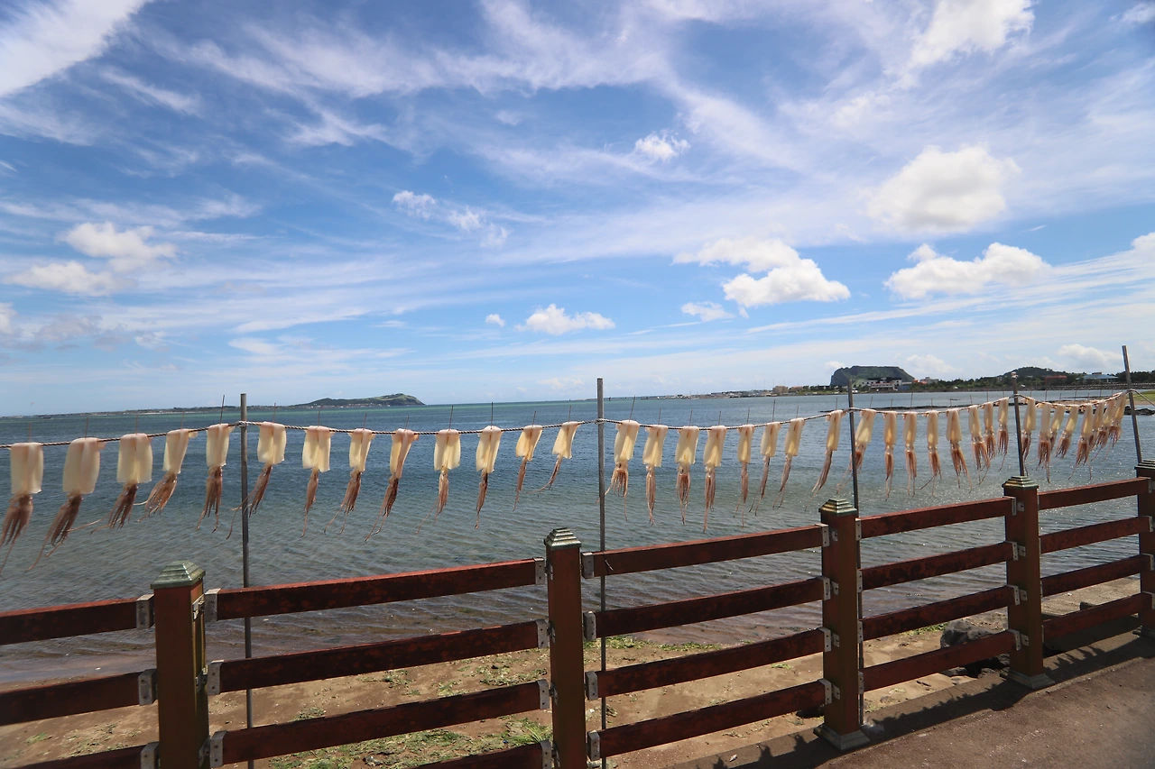 '성산짬뽕'을 나와 해안도로를 달린다. 해안도로를 달리다 보면 우도가 보이는 도로 길가에 '목화휴게소'가 있다. 이곳은 이미 명소로 많이 알려져 있다. 허름한 컨테이너 건물에 준치와 맥주를 파는 곳. 이곳은 레트로한 분위기 때문에 사람들이 많이 찾는다. 바닷가를 따라 쭉 메달린 준치의 풍경이 참 제주스럽다. 영화 '건축학 개론'을 보면 엄태웅과 한가인이 차를 타고 준치가 쭉 메달린 해안도로를 달리는데 그 배경이 이곳이다. 말린 준치를 뜨거운 돌에 구워주는데 간단하게 맥주 한잔 하고 가기에 좋다. 준치는 오징어이기는 한데 맛이 한치에 가까운 제주도 오징어로 '중치'라고 불리다가 '준치'로 굳어졌다고 한다. 왼쪽에는 우도, 오른쪽에는 성산일출봉! 세상 어디에도 없는 풍경을 바라보며 먹는 맥주와 준치의 조합! 말해 뭐할까. 운전은 아내에게 맡겨두고 뜨거운 햇볕 아래 취해간다. 그대로 해안도로를 따라 달려 집으로 돌아온다.