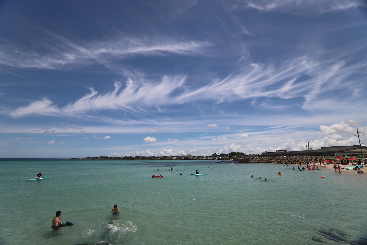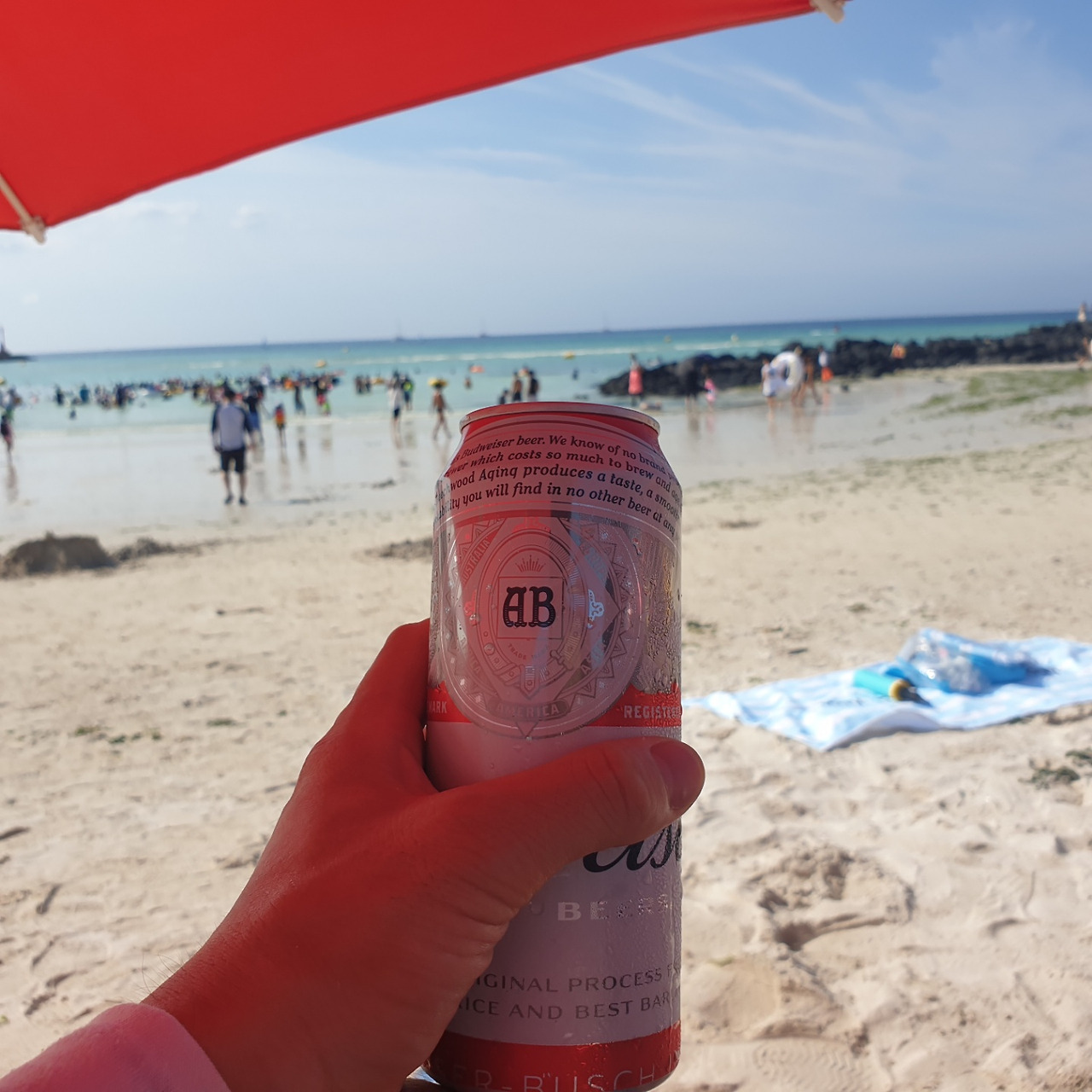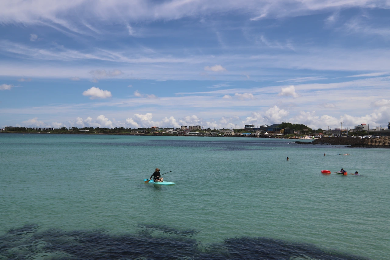 김녕바다는 파도가 낮고 모래사장이 넓게 펼쳐진 곳이다. 그래서인지 가족 단위의 관광객들이 많이 온다. 튜브를 탄 아이들이 물에 동동 떠서 즐거운 물놀이를 하고, 어른들은 파라솔 아래 이국적인 바다의 풍경을 보며 맥주를 마신다. 물놀이에 빠진 아이들 덕에 캠핑 의자에 앉아 나도 맥주를 마셔 본다. 강렬한 태양과 에메랄드빛 바다가 감성에 빠져들게 한다.