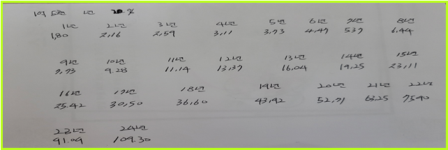 1.5억을 1.2(년20프로)수익률은 20번 곱해보면 계획이 나오는 구조다.