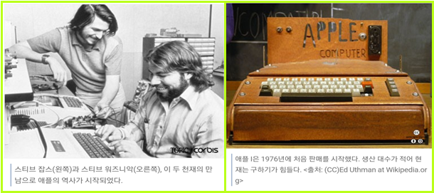 1974년, 대학을 중퇴하고 컴퓨터 게임 회사인 아타리사에 근무하던 “스티브 잡스”와 대형 컴퓨터 업체인 휴렛패커드(HP)의 직원이었던 “스트브 워즈니악은 컴퓨터 제작 동호회인 ”홈브류 컴퓨터 클럽“에서 의견을 나누며 직접 컴퓨터를 만들어 돈을 벌겠다는 계획을 세운다. 당시 컴퓨터에 쓰이던 CPU(중앙처리장치)는 인텔 i8080이었다. 가격 대비 성능이 높은 모토로라의 MC6800CPU를 더 선호했으며?이들이 만든 컴퓨터에는 MC6800 계열 CPU 중에서도 저렴한 MOS 6502를 탑재하기로 했다. 이 컴퓨터의 첫 번째 시험모델은 1976년 3월에 완성되었다. 이 컴퓨터의 시험모델을 자신이 일하던 HP의 간부들에게 보여주고 이를 제조해 판매할 것을 제의했으나 거절당했다. 이러한 이유로 잡스와 워즈니악은 자신들이 직접 부품을 모아 창고에서 제품을 제조해서 판매할 수밖에 없는 상황에 부닥치게 되었는데, 판매망을 이리저리 수소문하던 잡스는 캘리포니아 마운틴뷰에서 ”“바이트 삽”이라는 컴퓨터 판매장을 운영하던 “폴 테럴”에게 시험모델을 보여주었다. 이 새로운 컴퓨터에 흥미를 느낀 타렐은 30일 안에 50대를 납품해 달라고 요청한다. 자금이 부족했던 잡스와 워즈니악은 자신들이 소유했던 차량과 전자계산기 등을 급히 팔아서 컴퓨터를 생산할 자금을 마련하고자 했으나, 충분한 부품을 확보하기에는 부족했다. 그래서 잡스는 아타리의 기술자인 “론 웨인”에게 주식 10%를 준다고 제의해 자금을 투자하고 기술 고문을 담당하게 했다. 이렇게 잡스와 워즈니악, 그리고 웨인을 포함한 3명은 본격적인 생산을 시작했고 1976년 4월 1일, 회사도 설립했다, 회사의 이름은 <애플>, 그리고 컴퓨터의 이름은 애플I이라고 붙였다. 그렇게 컴퓨터를 만들어야겠다는 작은 계획에서 세계적 기업 애플이 탄생하게 된다.