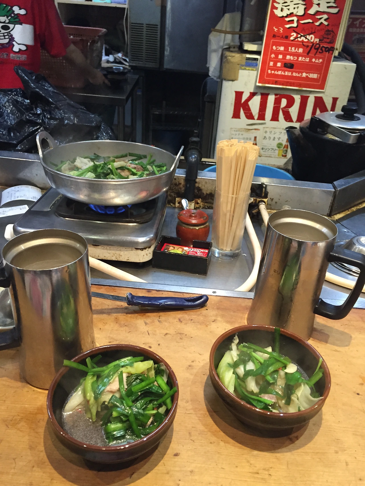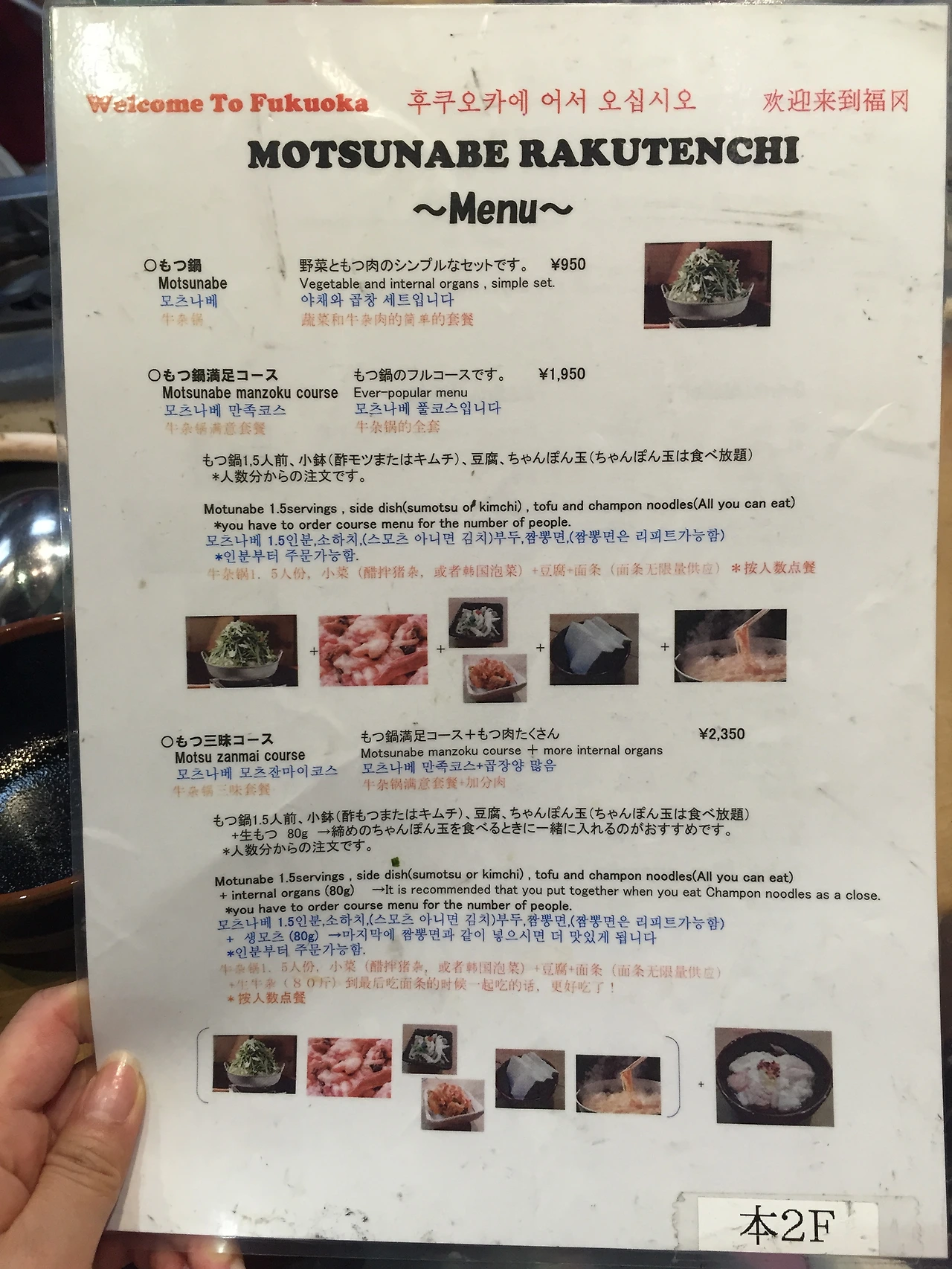 다행히도 식당은 어렵지 않게 찾을 수 있었다. 라쿠텐치 텐진점. 생각보다 내부는 작고 허름했다. 6시가 조금 넘은 이른 시간이라 그런지 손님이 그리 많지는 않았다. 우리는 간단하게 모츠나베 2인분을 주문. 빠질 수 없는 생맥주도 주문. 하지만 저 잔에는 비밀이 있었으니... 맥주가 2/3 정도밖에 들어있지 않은 것... 충격적!! 어쩐지 잔이 너무 가볍다 했다. 차가움을 유지하기 위함인지 모르겠으나 잔 바닥의 1/3 정도 혹은 그 이상이 빈 공간이다. 야채가 수북하니 많아서 좋았으나 곱창은 너무나 질겼다. 잘 삼켜지지 않을 정도. 나중에 알았지만 우리가 한국에서 먹는 곱창은 표백제라던지 약품을 써서 부드러운거고 화학공정을 거치지 않은 곱창은 원래 질기다고 한다. 그래도 맛있게 잘 먹었는데 국물이 계속 졸아서 점점 짜지더니 마지막 짬뽕면 사리를 넣었을 때는 많이 짰다. 우리가 알던 곱창전골과는 다른 간장 맛의 곱창전골. 처음 먹을 때는 간도 알맞고 야채의 단맛이 우러나면서 깔끔한 맛을 선사했으나 질긴 곱창과 점점 깊이 우러나는 짠맛 덕분에 뒤로 갈수록 맛이 별로였다. 빨리 드시거나 중간에 불을 끄는 걸 추천합니다.