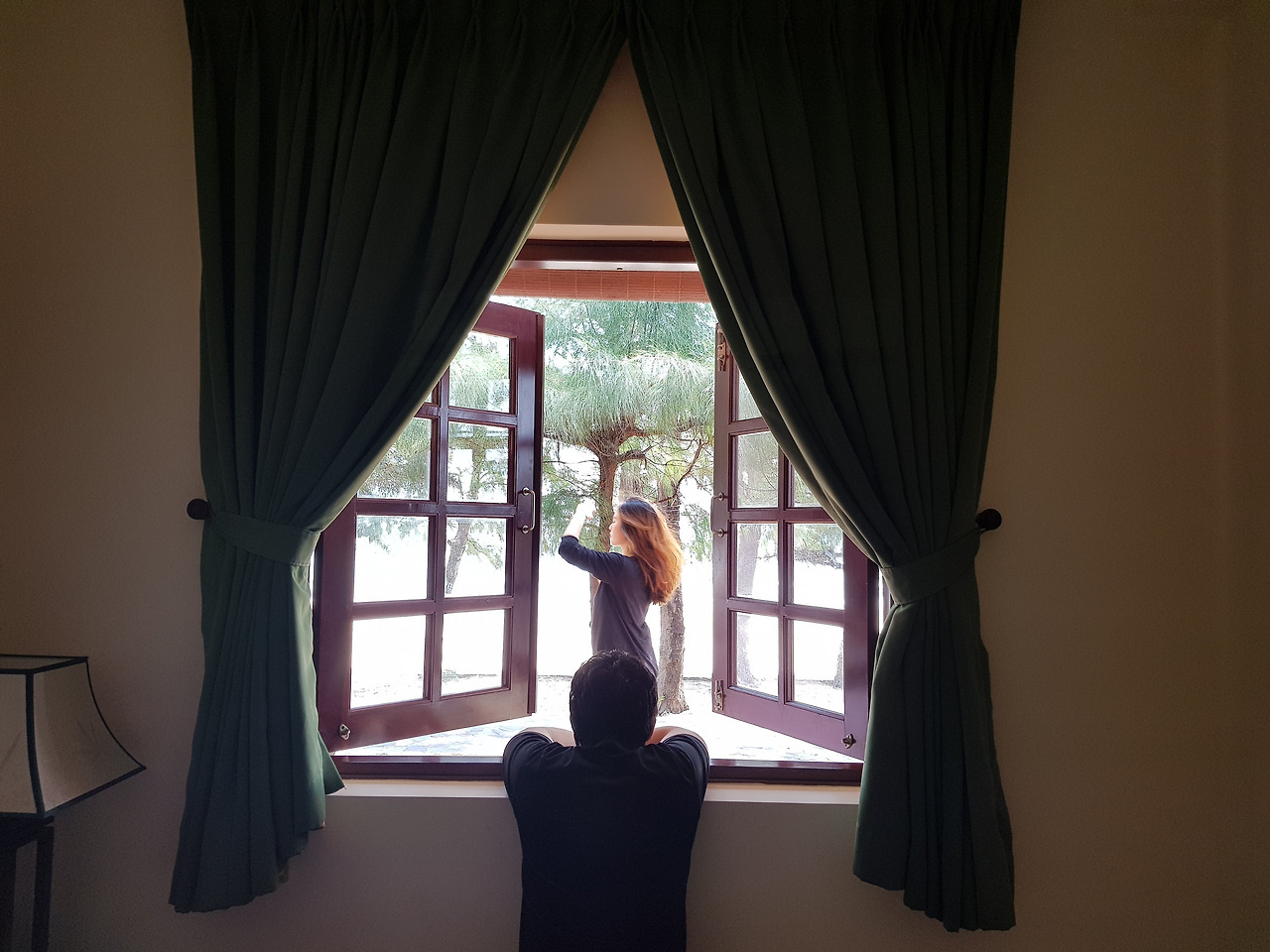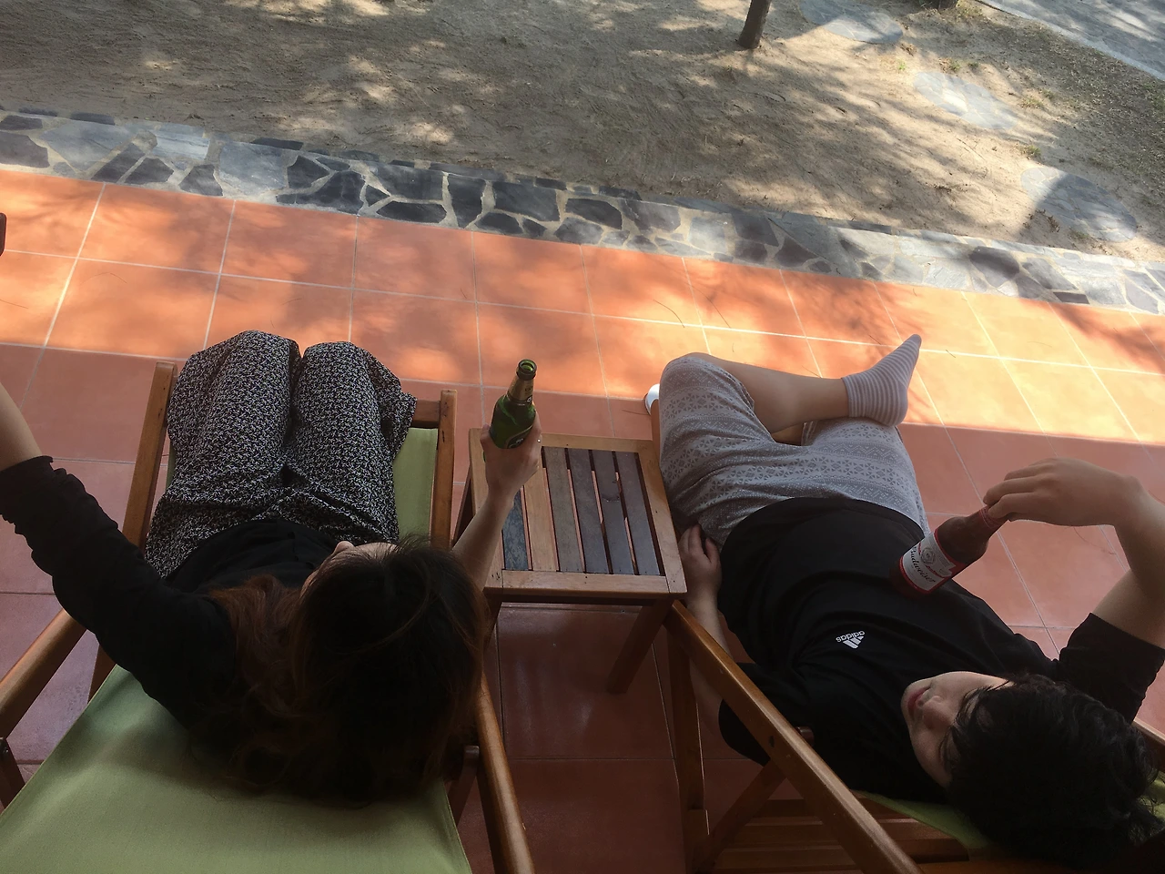 4명이 방을 같이 쓰려다 보니 숙소를 고르는데 꽤나 고민을 많이 했다. 몇날 며칠을 고민해서 잡은 숙소였는데 1층 유리창과 테라스의 의자를 보는 순간 어머!! 이건 너무 훌륭해!! 멋진 뷰와 자리에는 역시 술이지!!