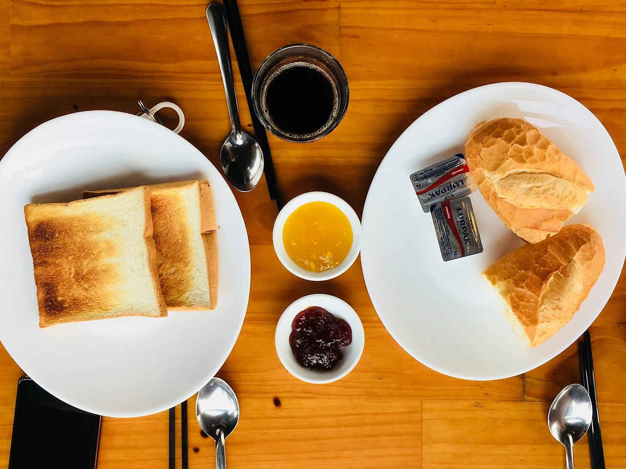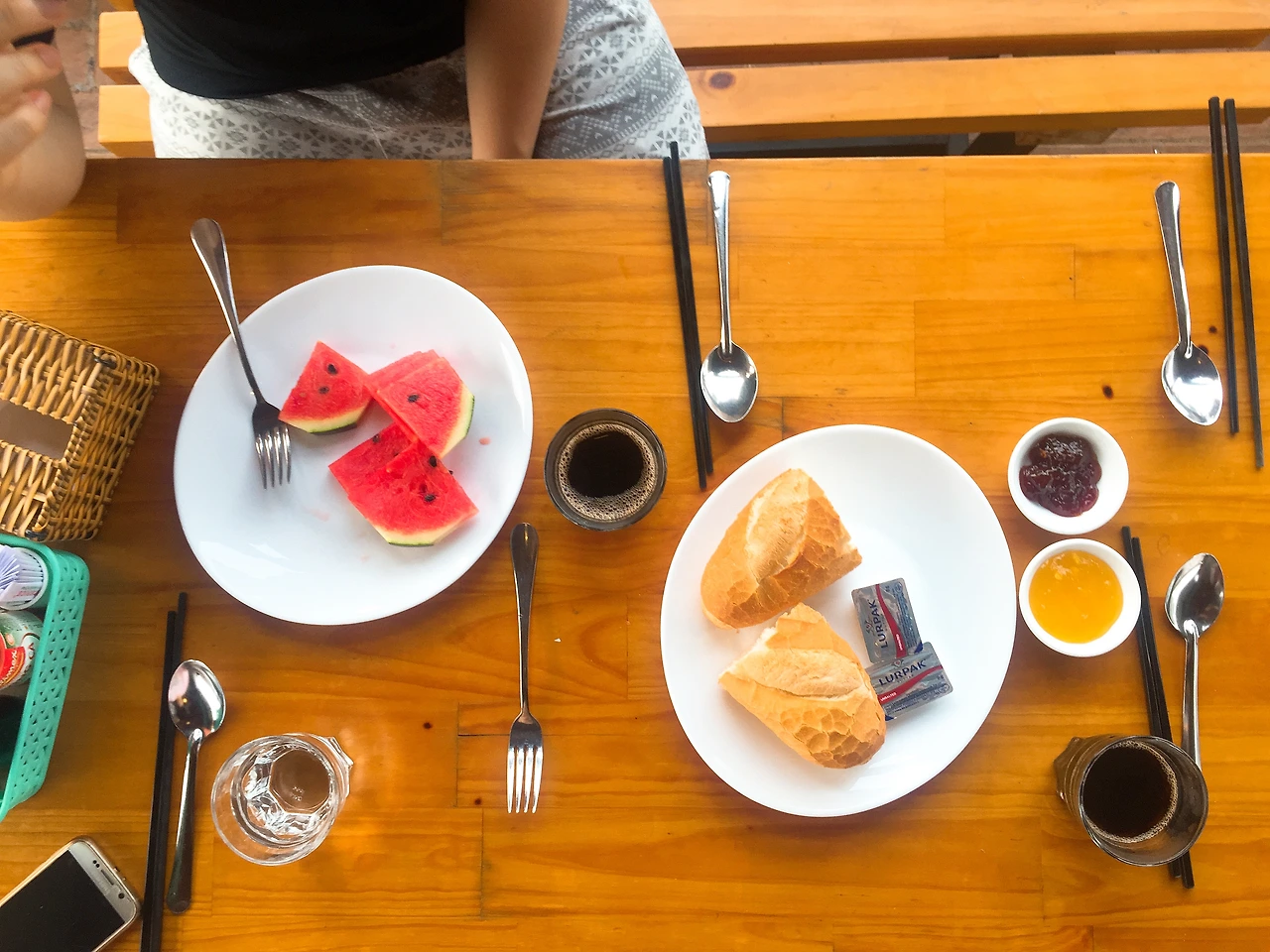 일어나기가 너무 힘들었지만 공짜로 주는 밥을 안 먹을 순 없지 아니한가. 아이들을 깨워서 조식 먹으러 옥상으로 갔다. 바람 맞으며 조식을 먹으니 상쾌했다. 과일과 음료, 빵은 셀프로 가져다 먹고 메인 음식은 하나씩 골라서 주문할 수 있다. 우리는 각자 쌀국수, 볶음국수, 스크램블 에그를 주문했다. 수박은 달달했고, 바게트가 겉은 바삭, 속은 촉촉 너무 맛있었다. 쌀국수도 나쁘지 않았다.