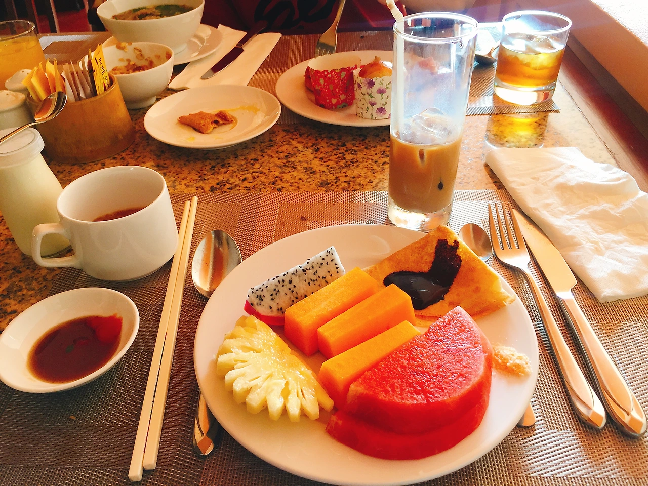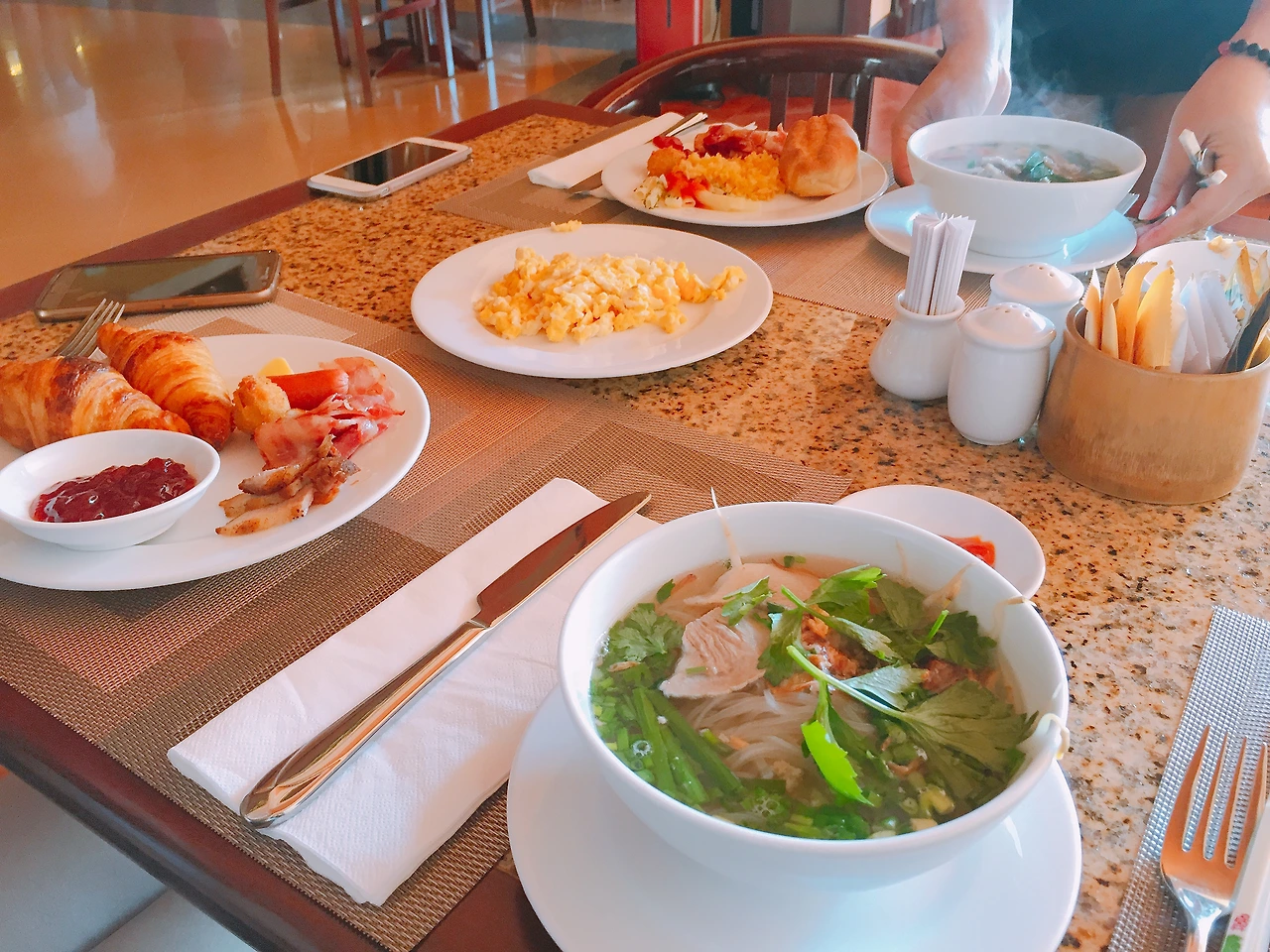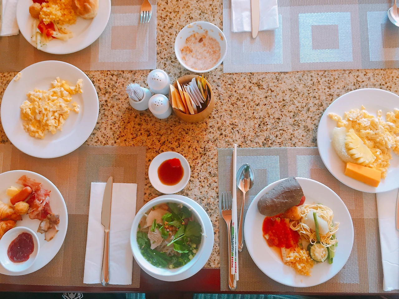 조식당은 생각보다 넓었고 우리는 꽤 괜찮은 자리에 앉았다. 한바퀴를 쓱 둘러보고 쌀국수와 계란은 필수라며 한 그릇씩 준비해본다. 쌀국수는 어딜가도 맛있고 나는 약간의 고수가 들어서 더 맛있었다. 음식의 종류는 그렇게 많지 않았지만 이곳에는 내가 좋아하는 2가지가 있었으니... 바로 카페 쓰어다와 파파야!! 조식에 파파야 나오는 곳이 많지 않았던 거 같은데 파파야가 있어서 너무 좋았고 카페 쓰어다는 너무 맛있어서 2잔을 먹었다.