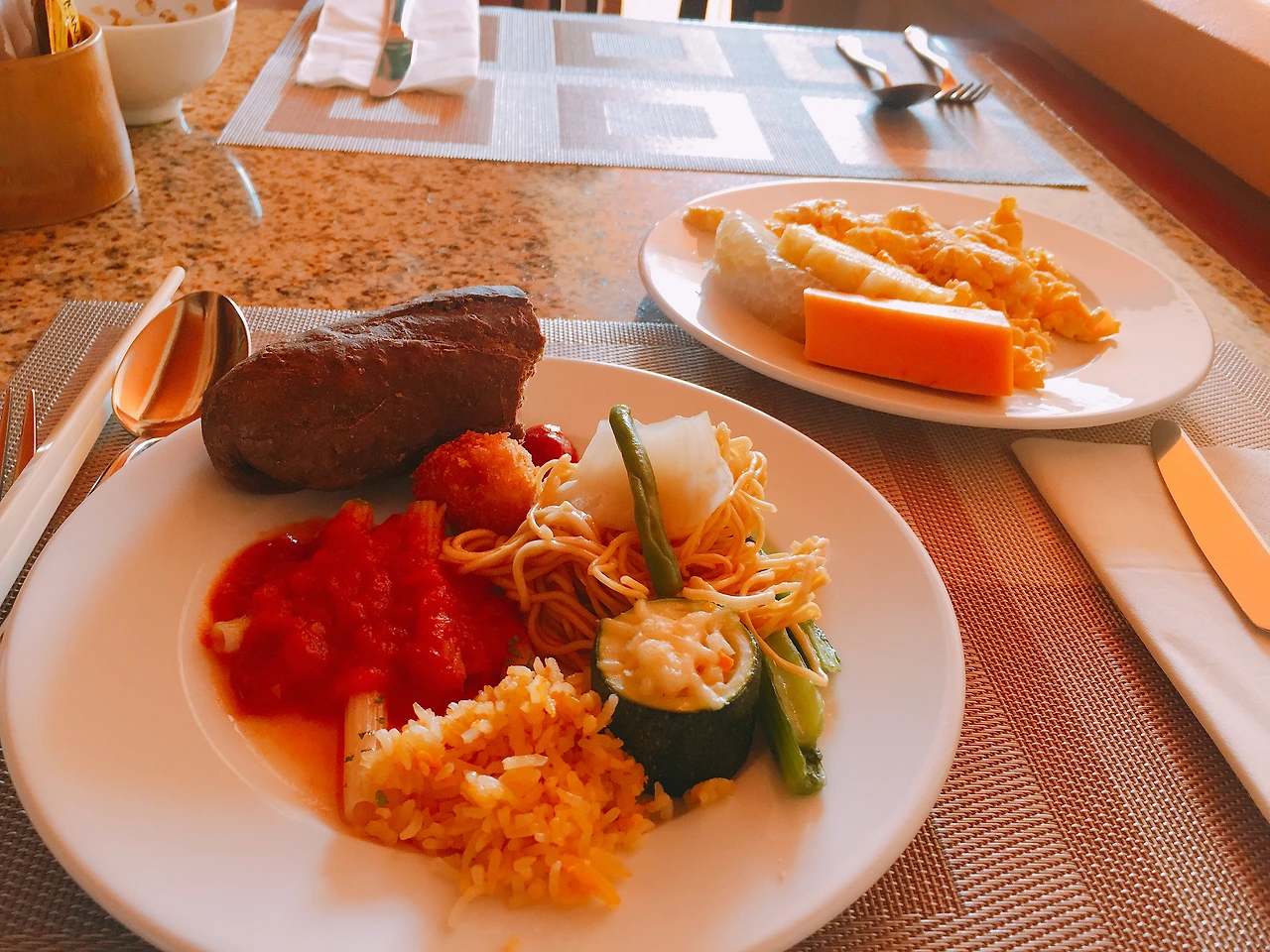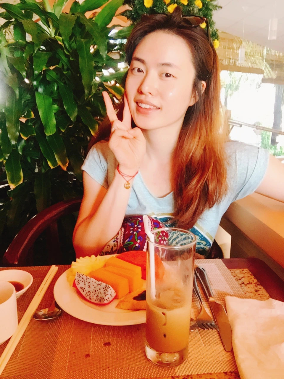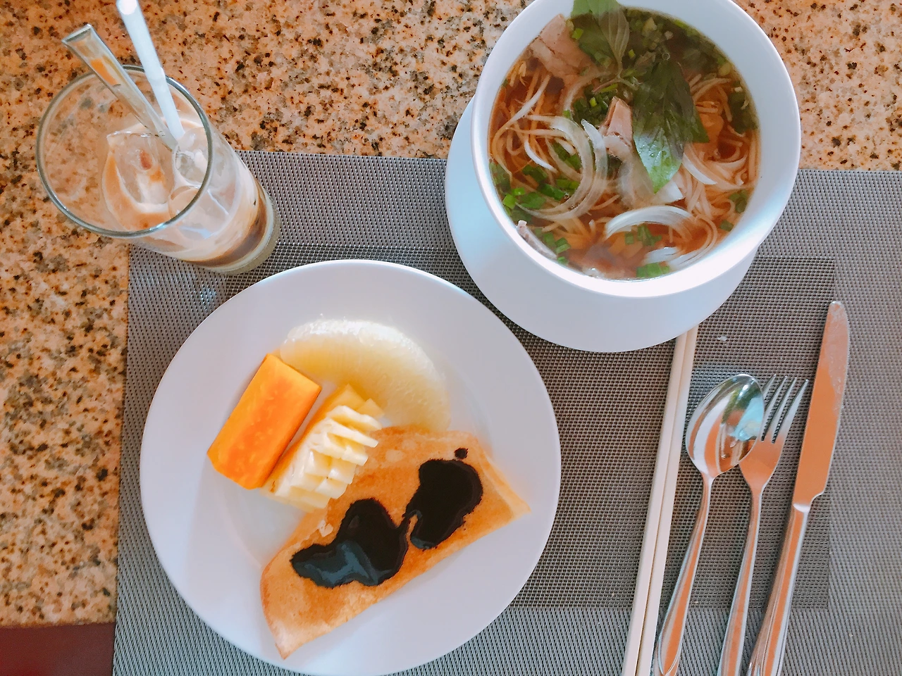 조식당은 생각보다 넓었고 우리는 꽤 괜찮은 자리에 앉았다. 한바퀴를 쓱 둘러보고 쌀국수와 계란은 필수라며 한 그릇씩 준비해본다. 쌀국수는 어딜가도 맛있고 나는 약간의 고수가 들어서 더 맛있었다. 음식의 종류는 그렇게 많지 않았지만 이곳에는 내가 좋아하는 2가지가 있었으니... 바로 카페 쓰어다와 파파야!! 조식에 파파야 나오는 곳이 많지 않았던 거 같은데 파파야가 있어서 너무 좋았고 카페 쓰어다는 너무 맛있어서 2잔을 먹었다.