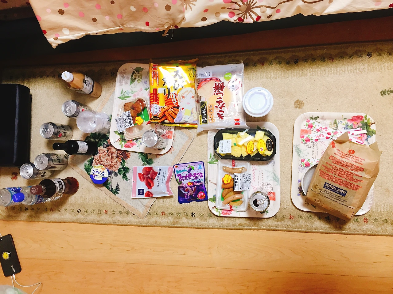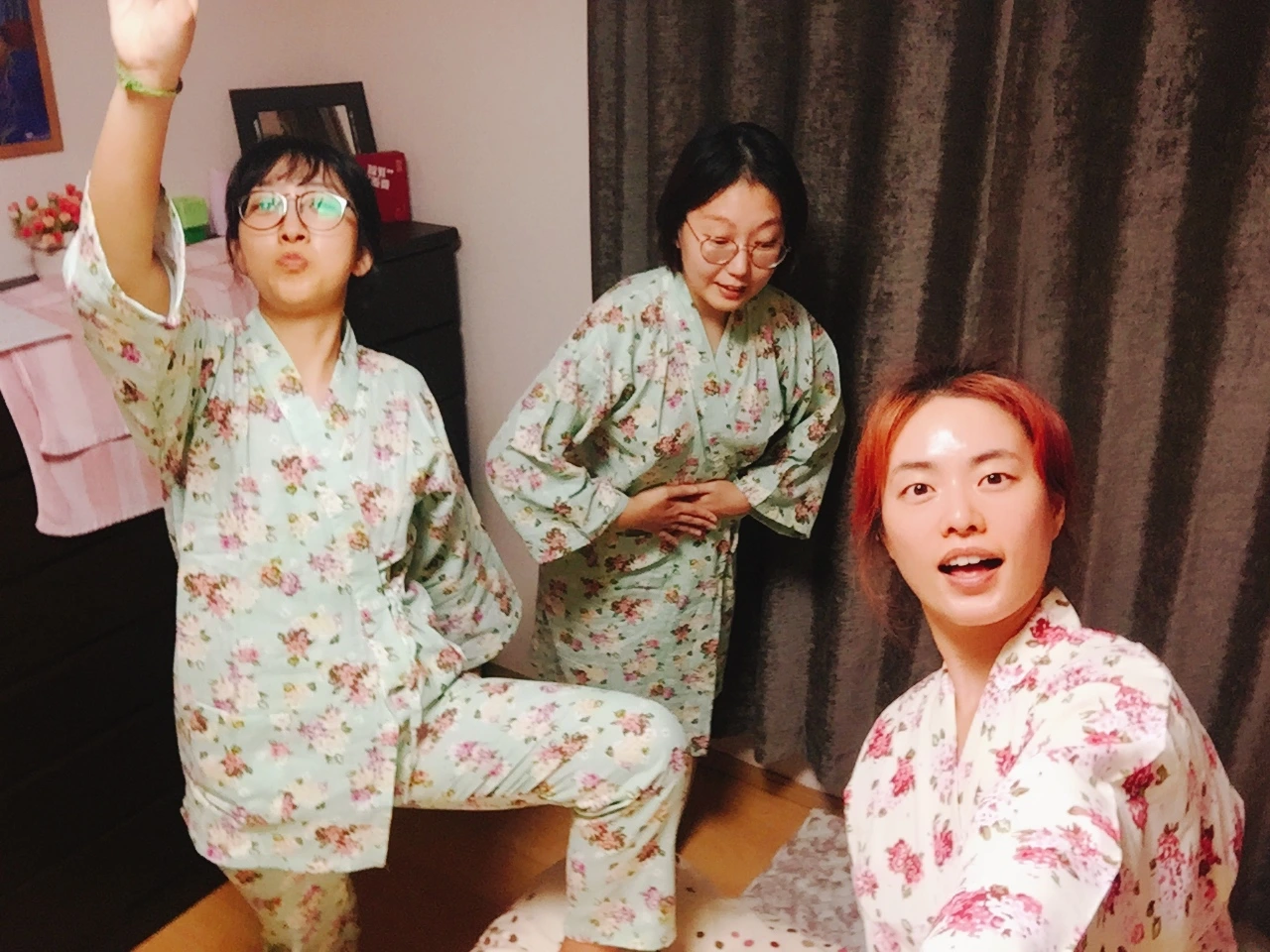 설레는 첫 여행에 싸구려 잠옷도 맞춰서 들고 온 우리들. 의상으로 일본 여행의 분위기를 한껏 더 올리며 마지막은 테라스에서 와인까지 배부르게 먹고 첫날을 꽉 채워 보냈다.