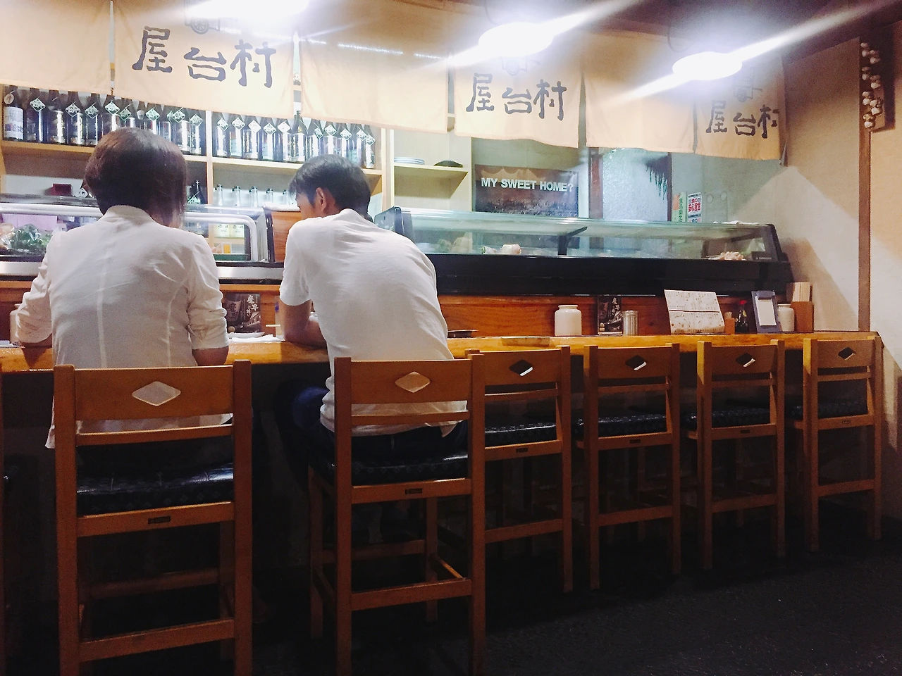 밖으로 나왔더니 비가 내린다. 걷다보니 폭우가 쏟아진다. 아무데나 들어가자 해서 들어갔는데 아저씨들 회식하는 분위기 같아서 나왔다. 비를 뚫고 또 다른 가게로 들어갔다.